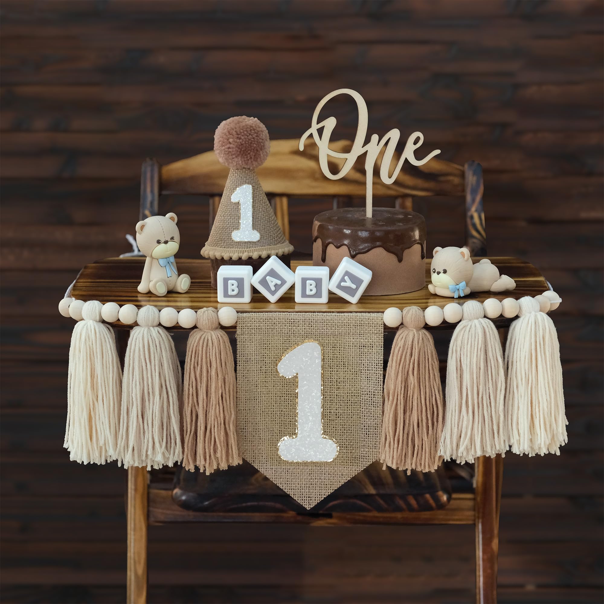 PACKAGE LISTS: A tasseled garland banner with the number one and wooden beads in white khaki brown; a brown cone hat with the number 1 and a one cake topper.