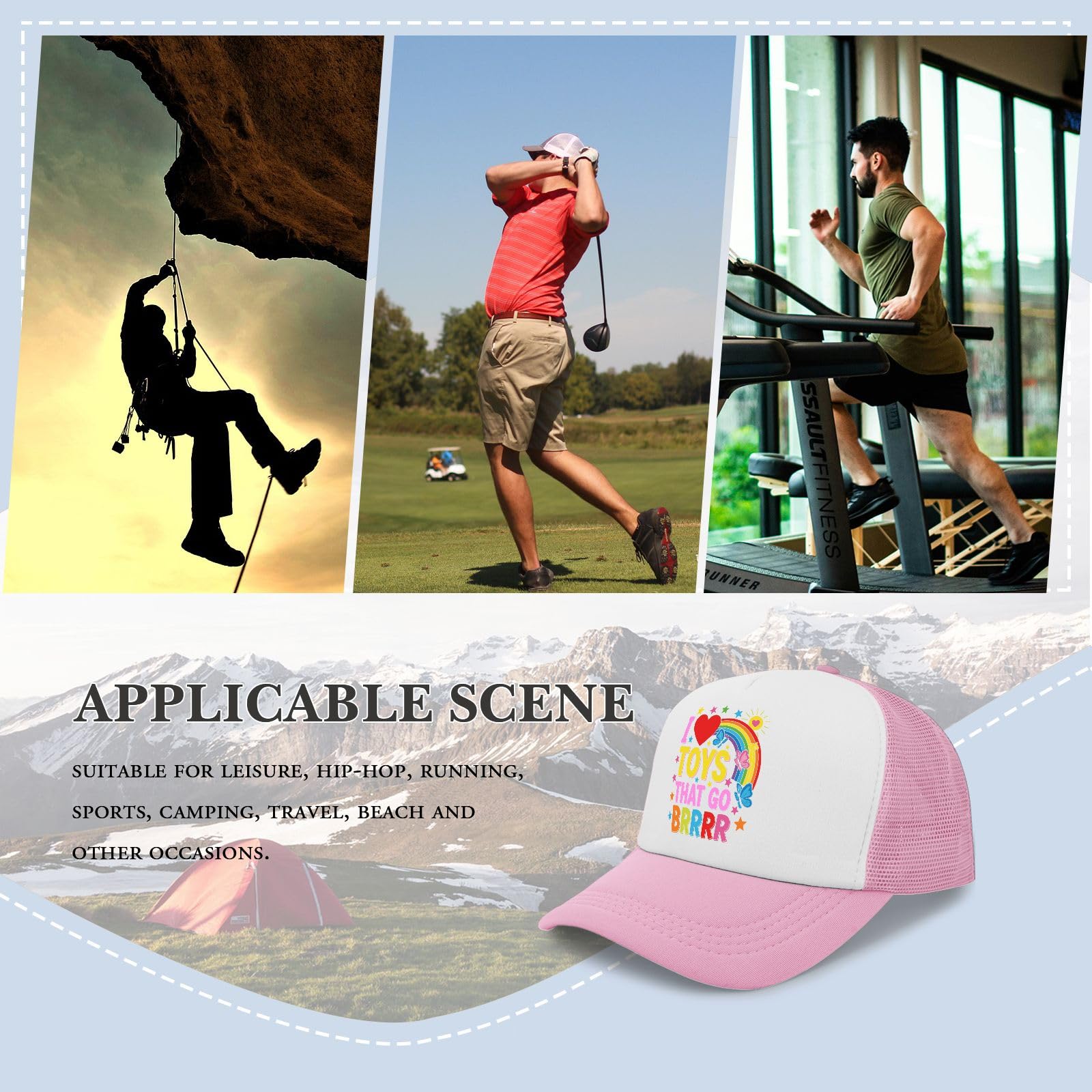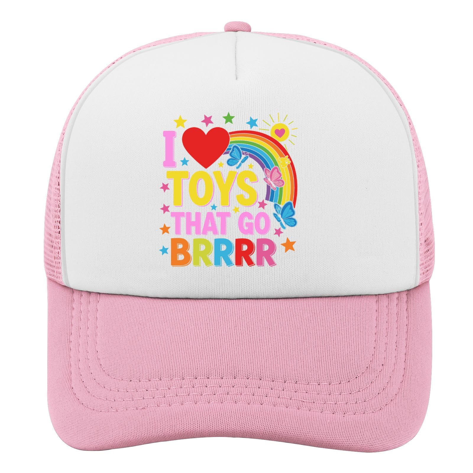 VERSATILE DESIGN: Pink and white trucker hat featuring mesh back panels for ventilation, with a colorful rainbow design and decorative elements on white front panel