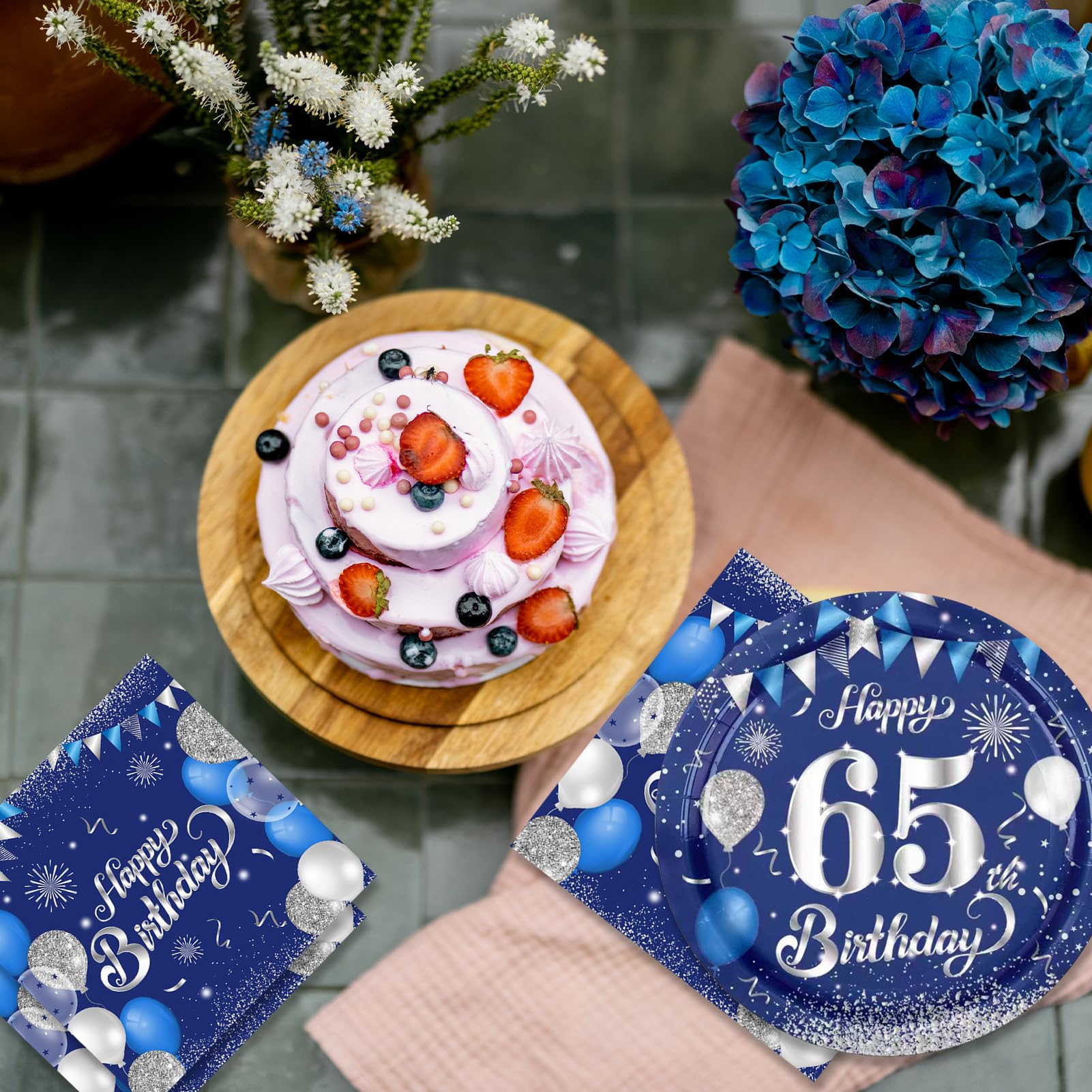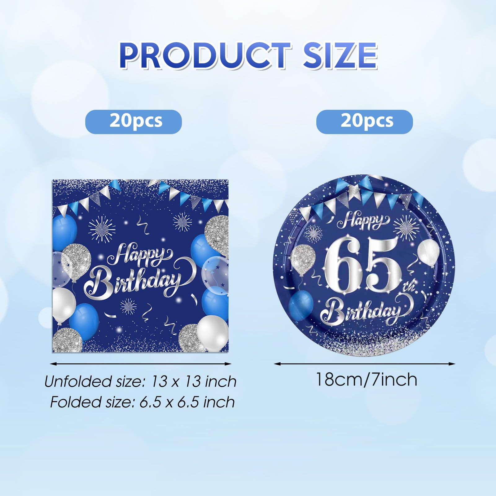【Happy 65th Birthday Decorations Set】You'll get 20 pieces of 7 inches 65 years old dessert plates, 20 pieces of 6.5 inches blue and silver napkins for each set that can serve 20 guests, creating a visually stunning table decor for your party.