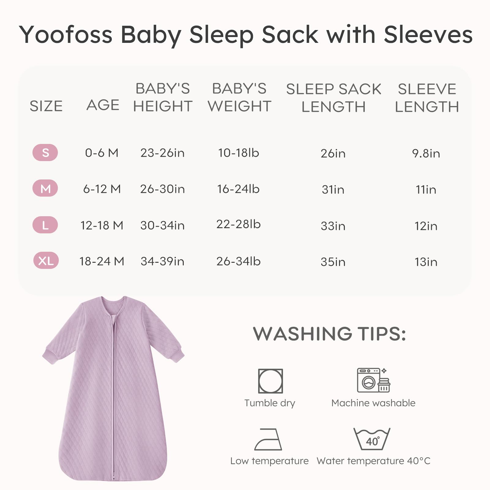 Available Size and Mahchine Washable: Available in 4 sizes for babies 0-24 months (S, M, L, XL). Machine washable for easy maintenance, these toddler sleep sacks retain their softness and durability wash after wash. Please measure your infant's height and weight, and refer to the size chart before choosing.