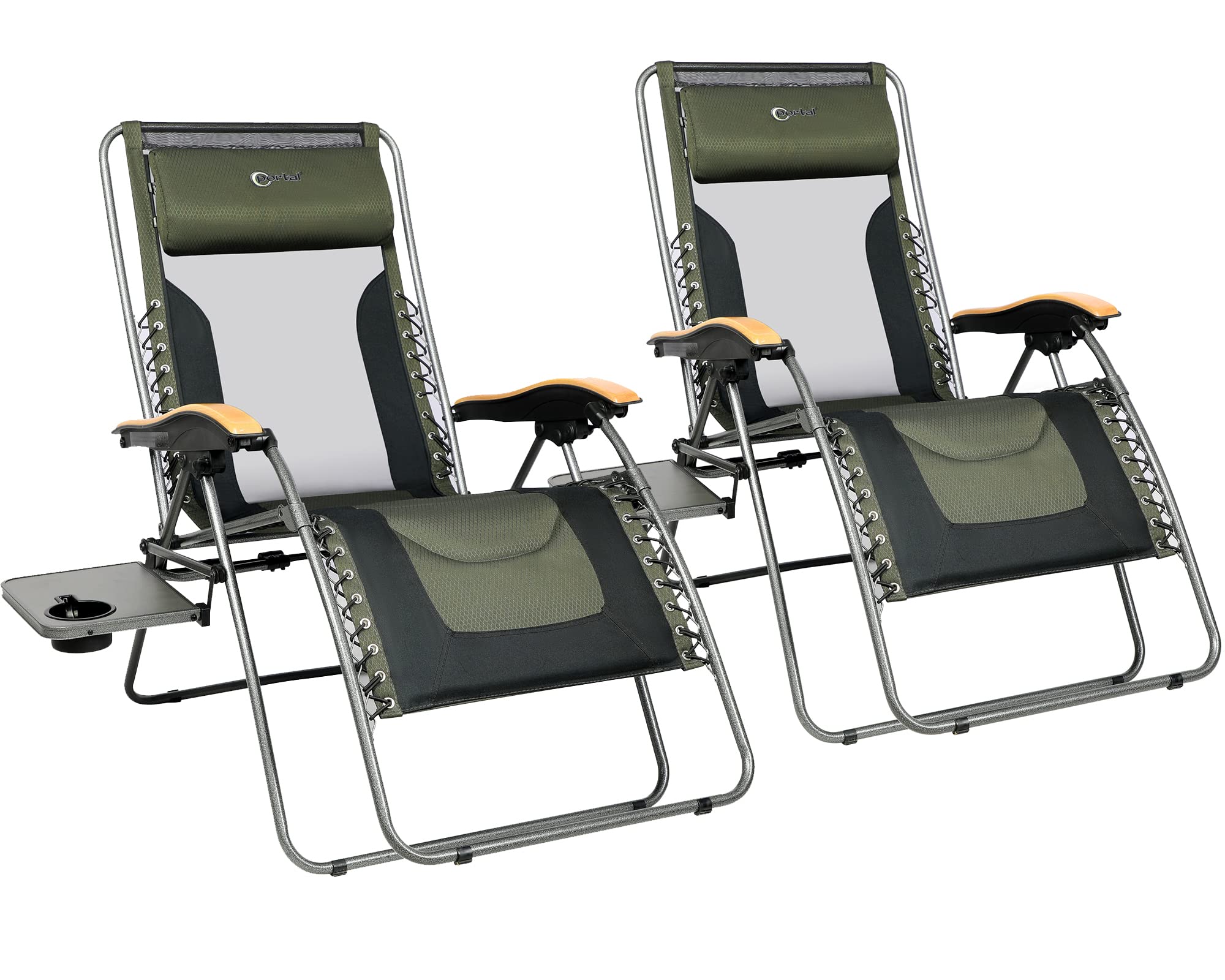 Utility Gravity Chair: Breathable mesh back connected to padded seats, adjustable padded pillow for both headrest and lumbar support, side table for drinks and phone storage.