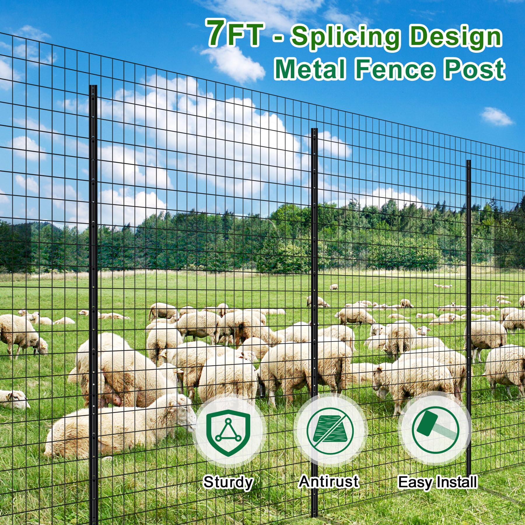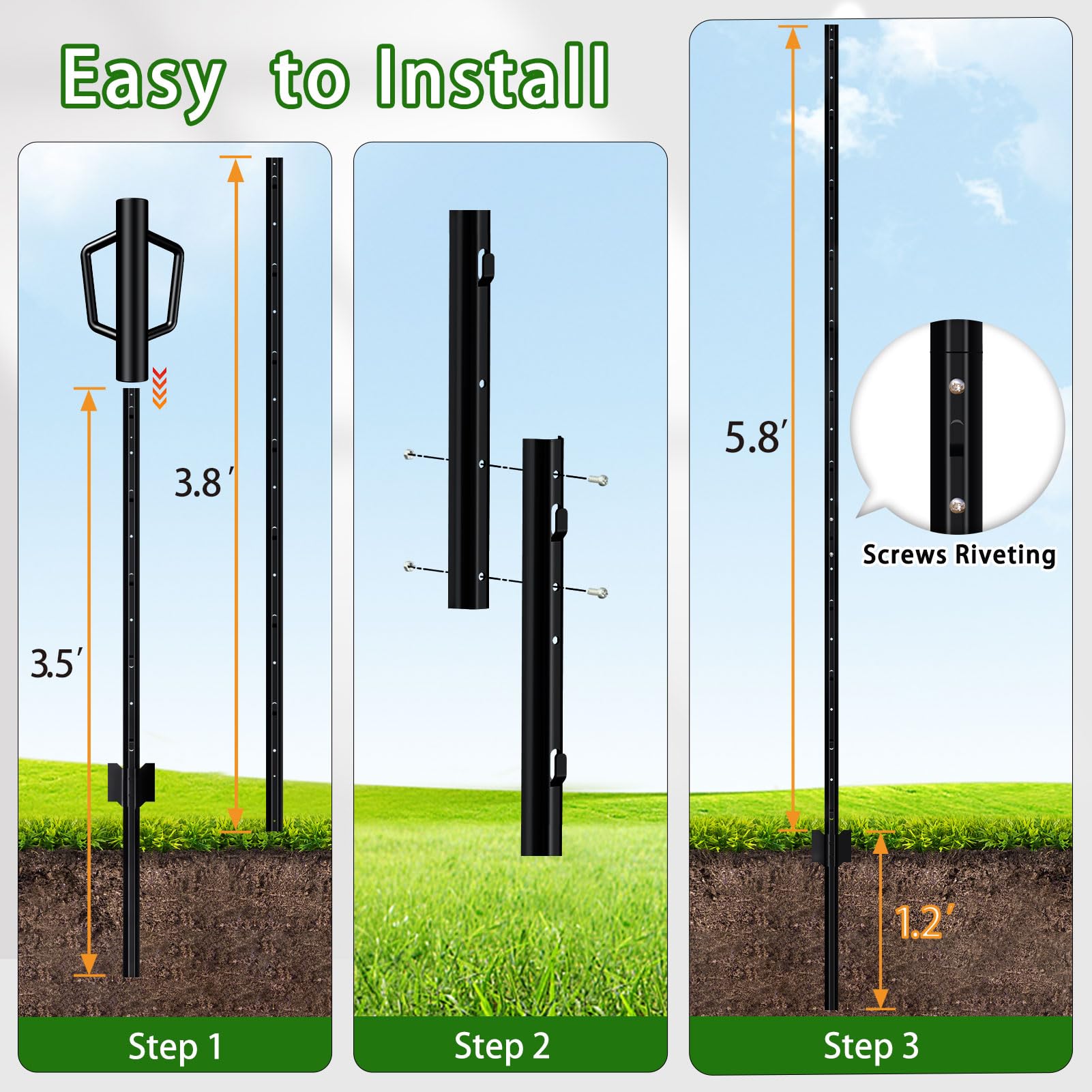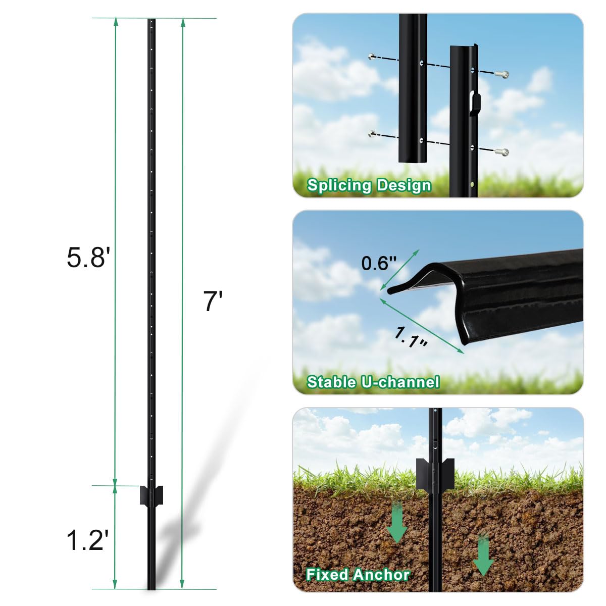 Fast and Easy Installation: No digging required, simply you can pond the bottom part with a hammer or post-driver into ground, until anchor plate is below ground level. Connect the upper part to the fixed bottom part by screws, after completing the splicing installation, 1.2’ length is fixed into the ground and the upper 5.8’ is for wire fencing. Easily attach the fence wire on the metal post tabs, then the fence is pulled up and supported well.