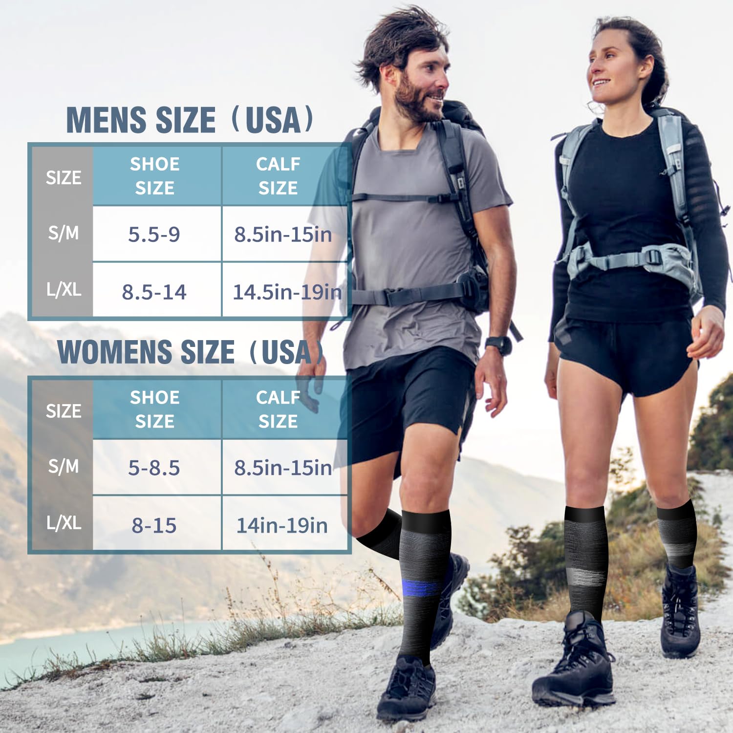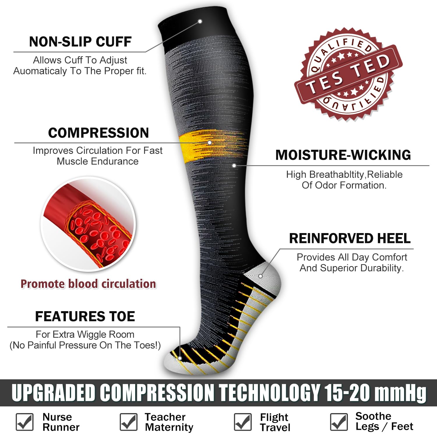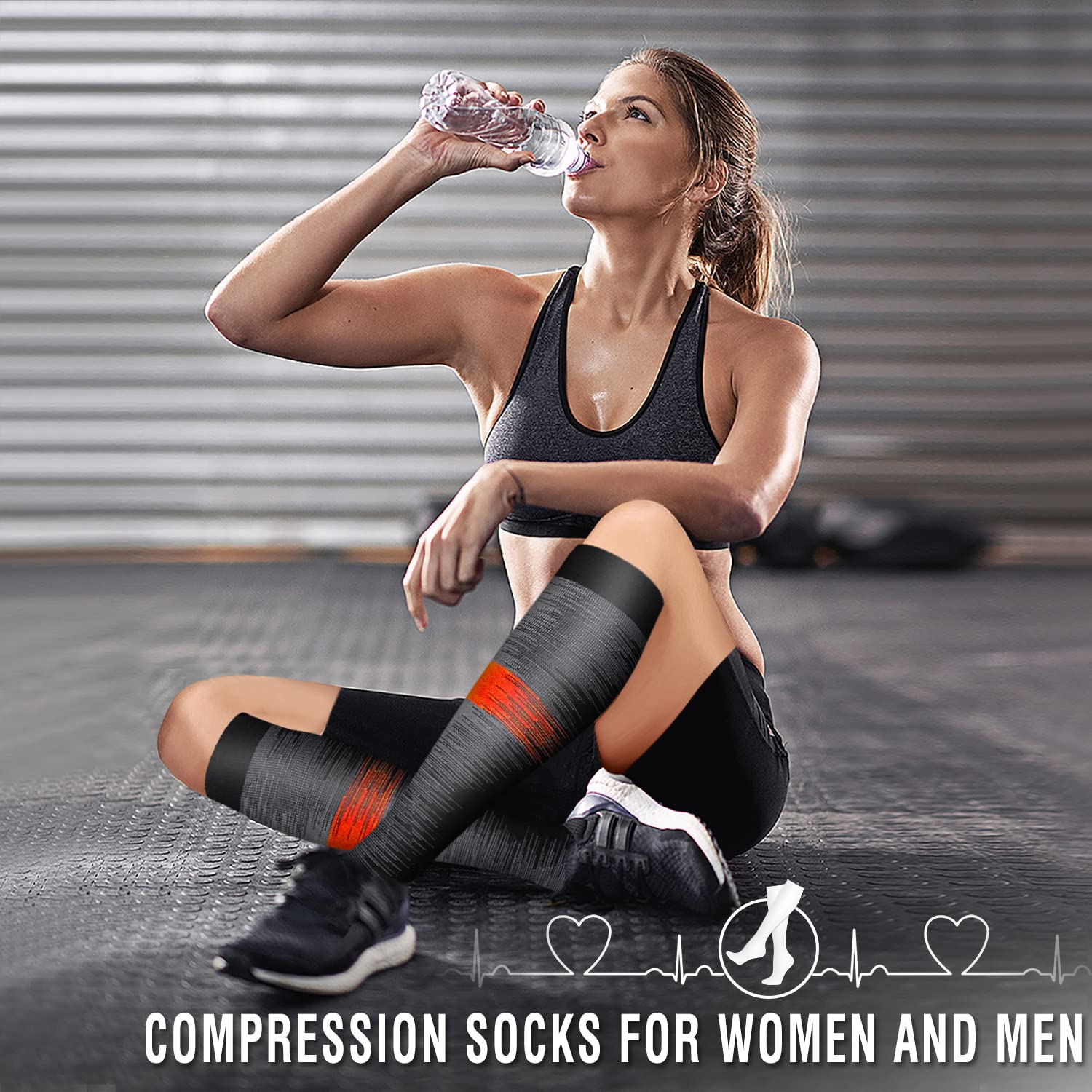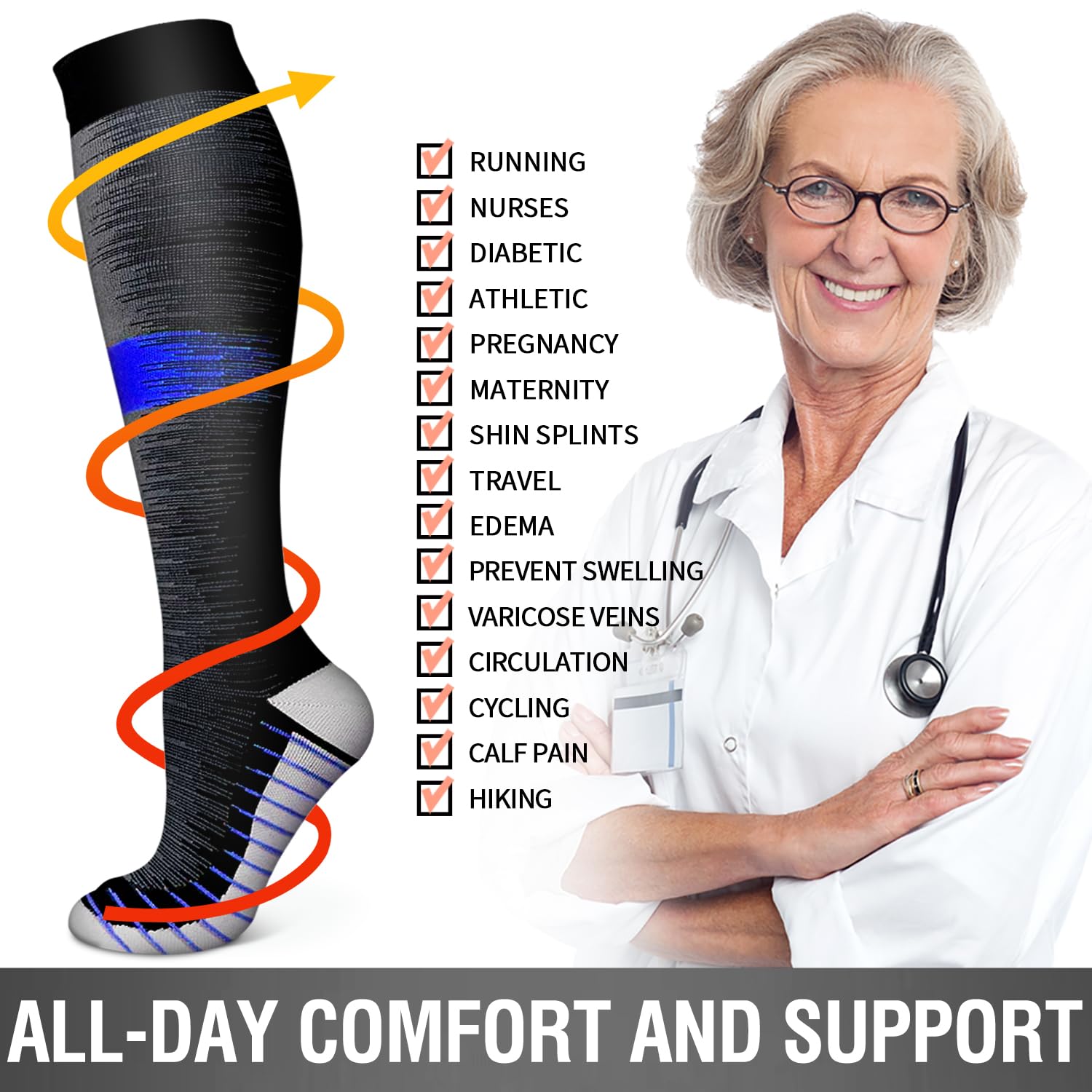 GIVE LIFE TO YOUR LEGS! - More improve circulation means more Healthier legs and less pain+swelling.Our Graduated Compression Socks put pressure in just the right spots.Provides true graduated compression to support your legs,reduce fatigue,soreness,and prevent injuries at the same time.Progressive compression technology has been recognized by many users Our copper compression socks is self-care staples.Make you feel great-no matter where,no matter when,and no matter what you're up to!