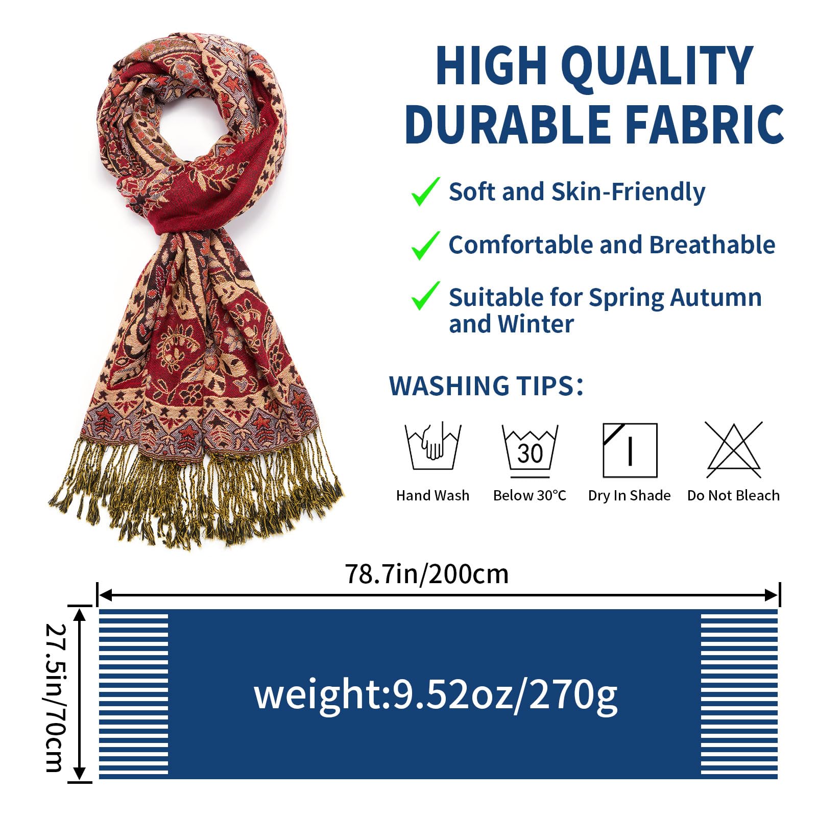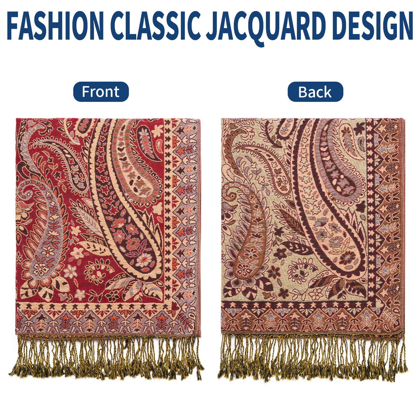 ★DOUBLE SIDED JACQUARD DESIGN - Our indian shawl is double-sided wearable design, the different colors of the two sides add more choices for your matching. The exquisite and unique jacquard details are exotic, very elegant and sophisticated, which will show off your fashionable taste whether it is for daily wear or special occasions. In addition, this pashmina wrap is also ideal as a luxurious and thoughtful gift for your mother, wife or girlfriend on Christmas, birthday or anniversary.