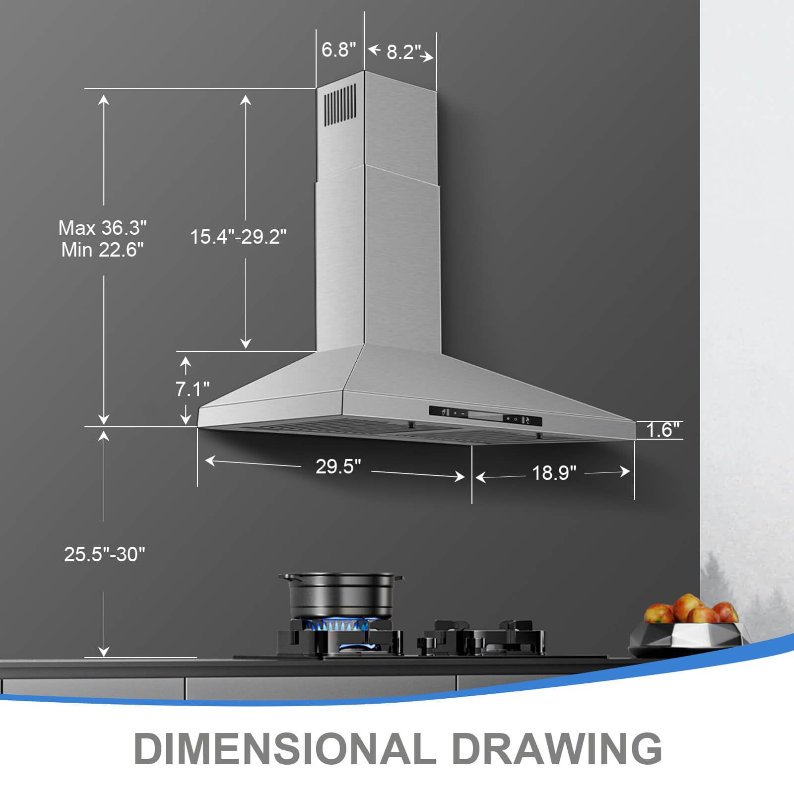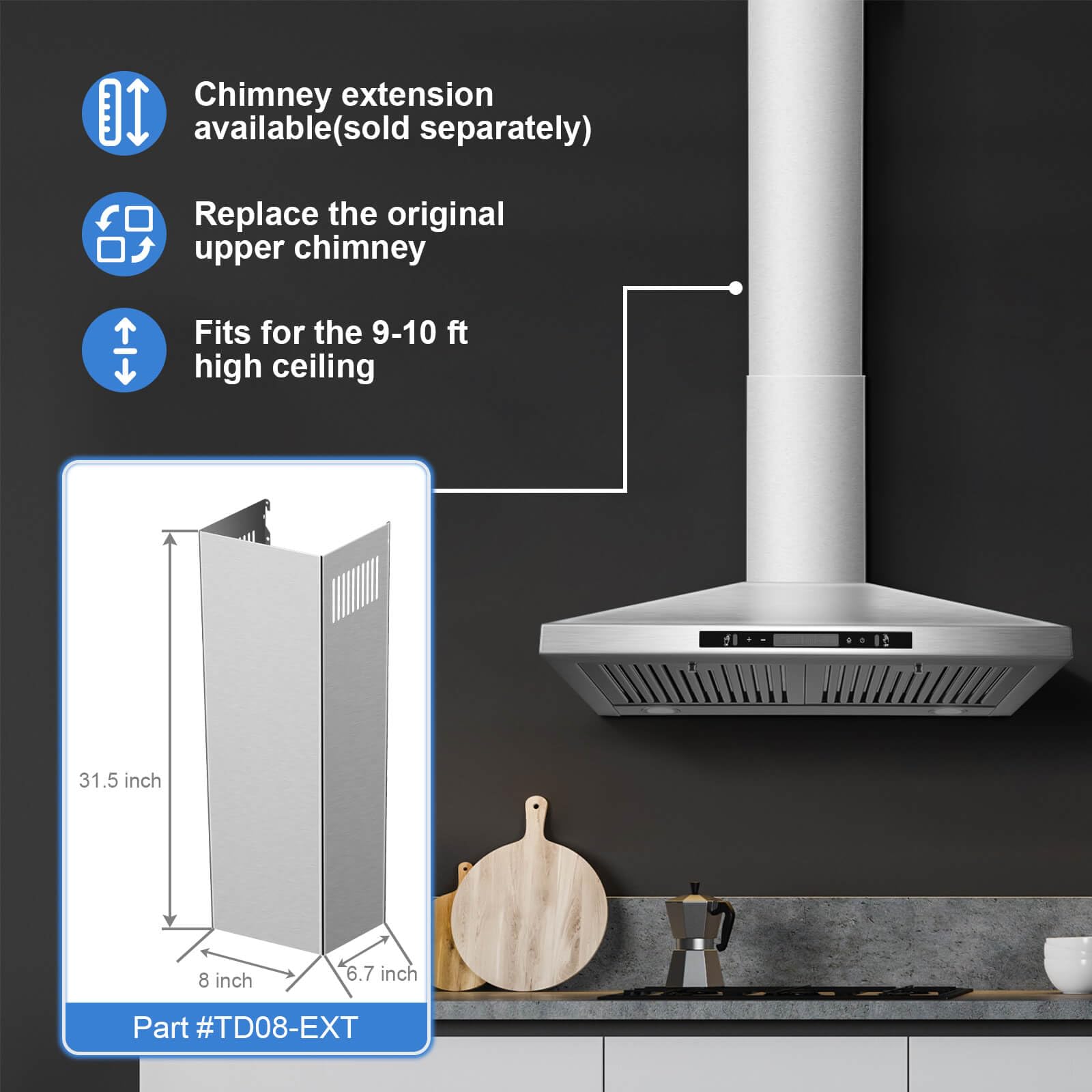 【Wall Mount Range Hood】A chimney-style wall mount range hood,two chimneys are adjustable from 22.6" to 36.3",fits for 7.5-8.5 Ft. ceilings.Chimney extension for optional(Part # TD08-EXT, Sold Separately),can replace the original upper chimney of stove hood vent,to match 9-10-Ft. ceilings