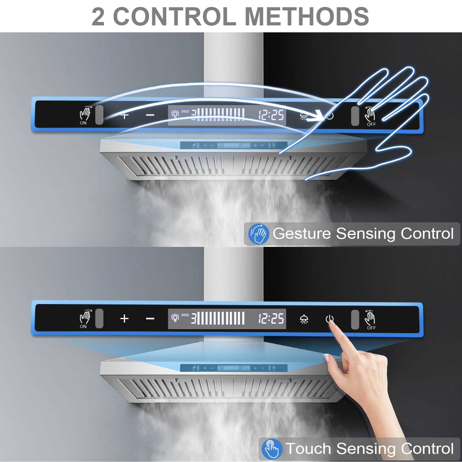 【2 Control Methods】With 2 control modes, including intelligent gesture sensing and soft touch control,can easily switch the function of stove hood as your needs during cooking,bring you a more pleasant and convenient operating experience