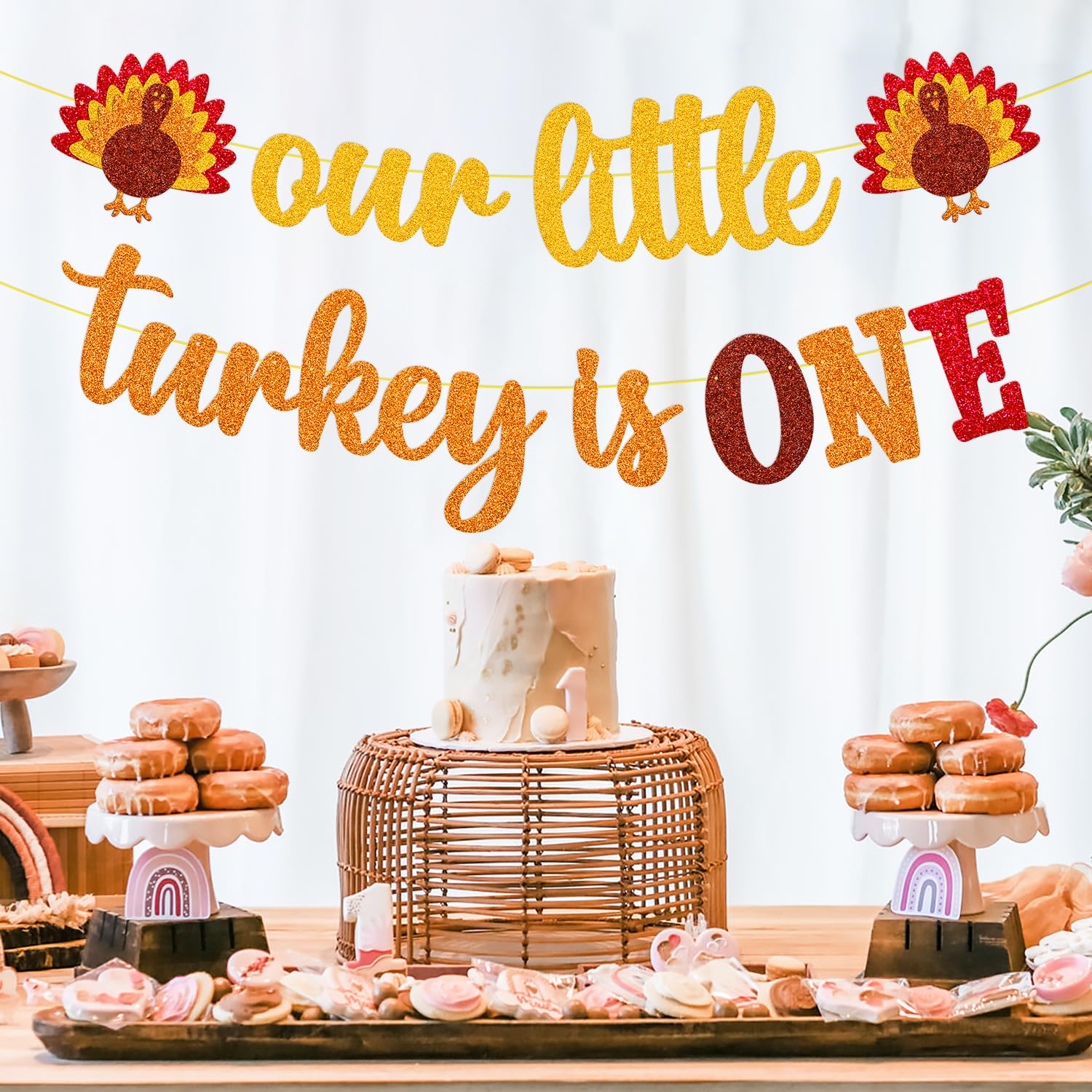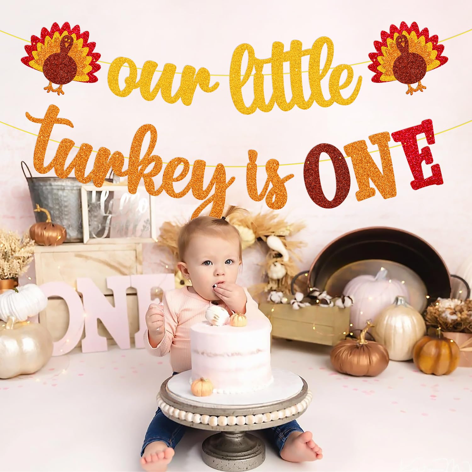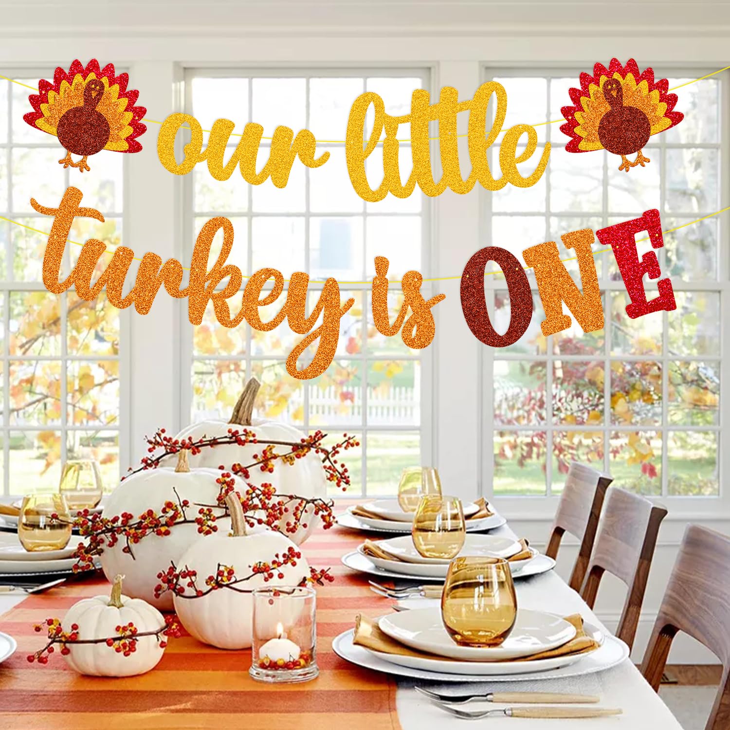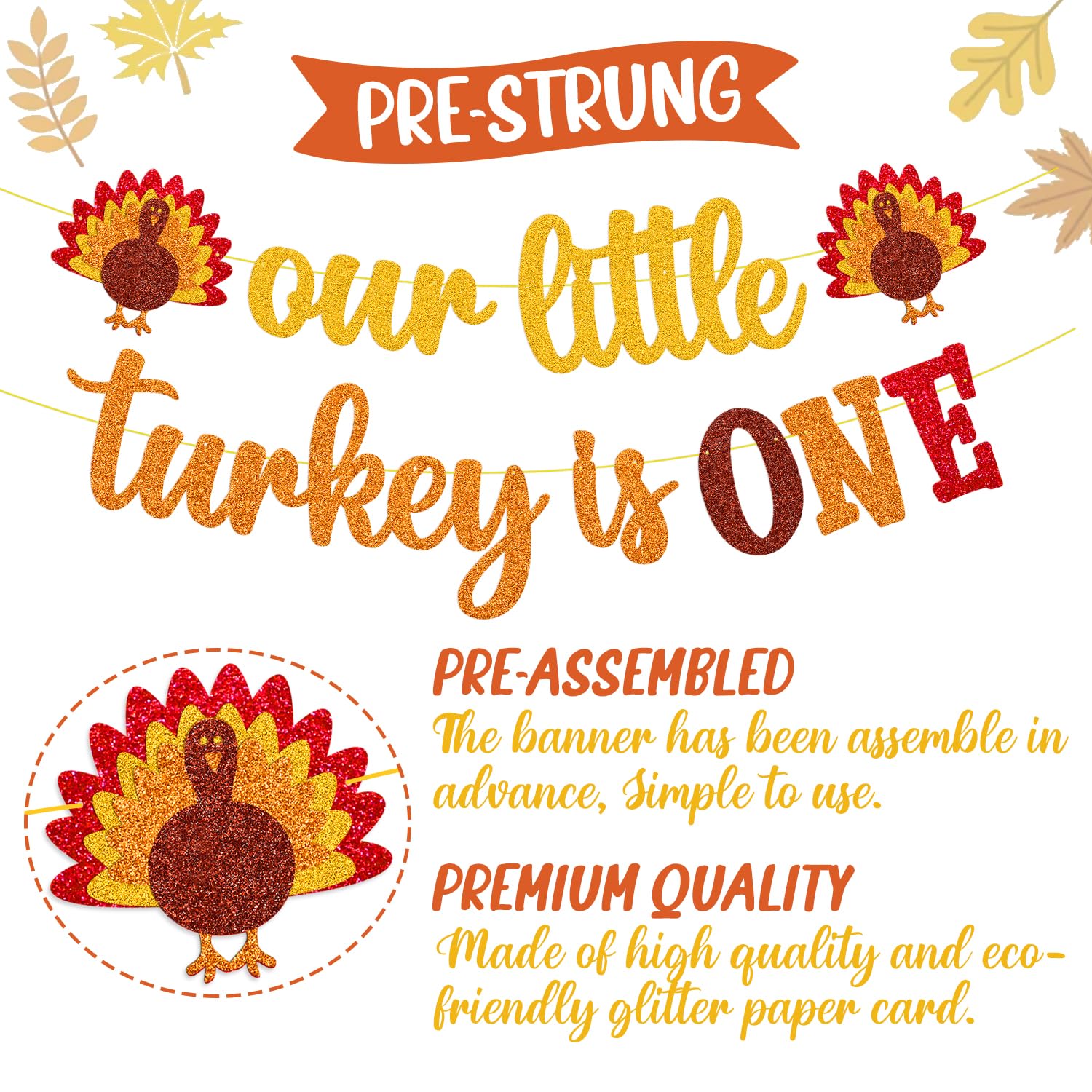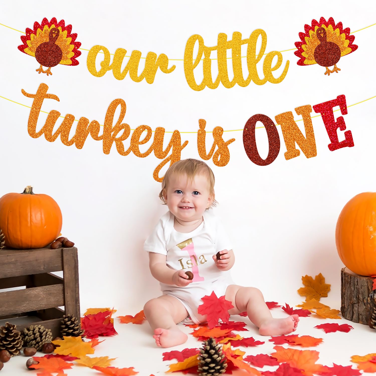 HIGH QUALITY: Thanksgiving Our Little Turkey is One banner is designed by using premium gold/orange glitter cardstocks. Thanksgiving 1st birthday banner would be displayed perfectly on the wall, outdoor, your thanksgiving party.