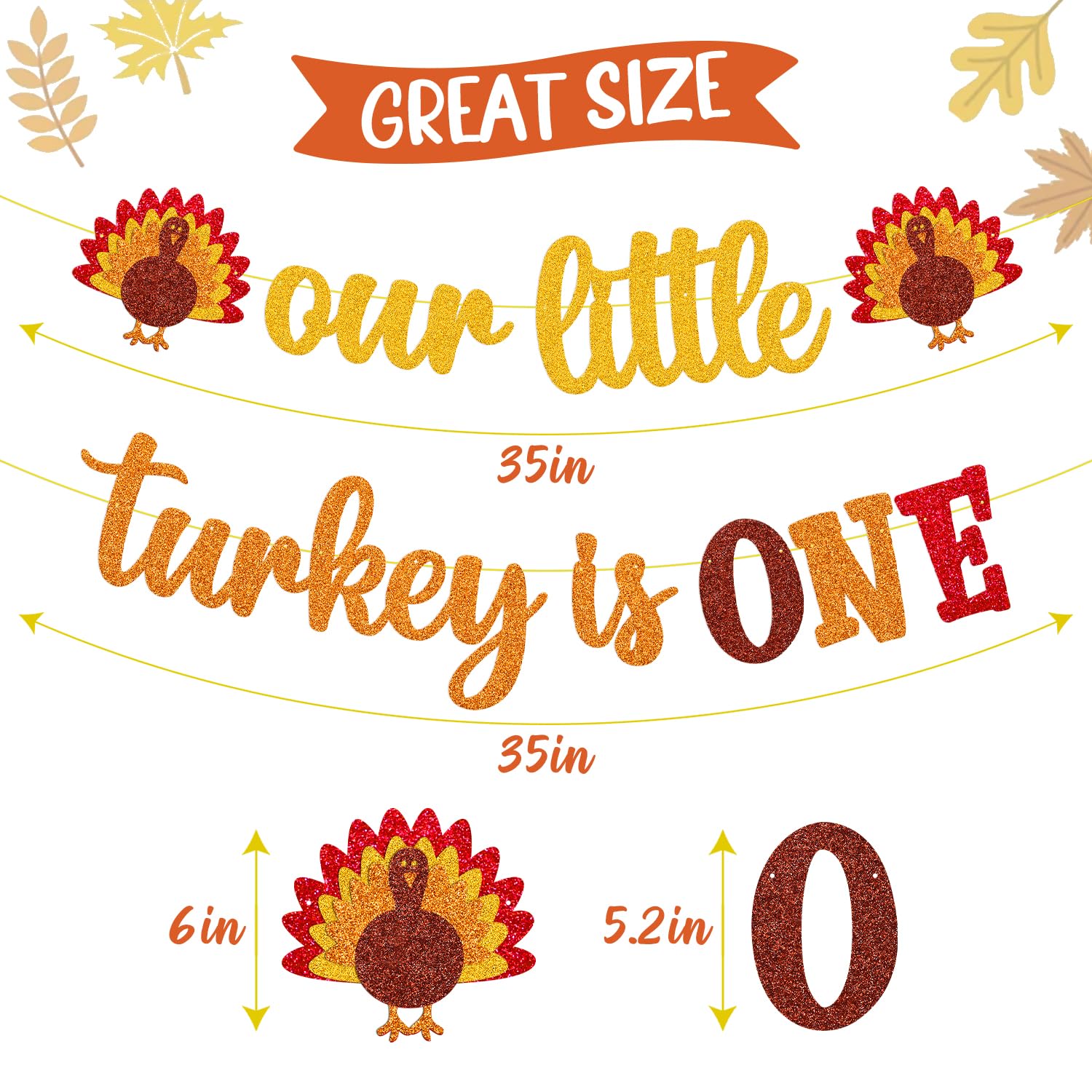 PERFECT SIZE: Our little turkey is one banner is approx. 35 inches in length. Each letter is approx. 5.2 inches in height. The best way to decorate your thanksgiving 1st birthday party and baby shower is to use the our little turkey is one decoration.