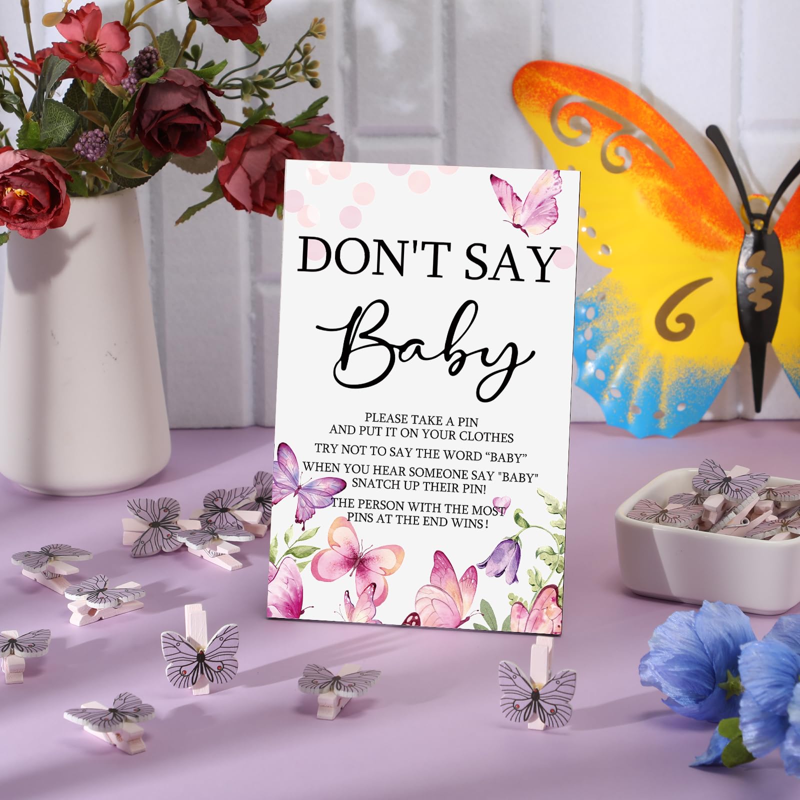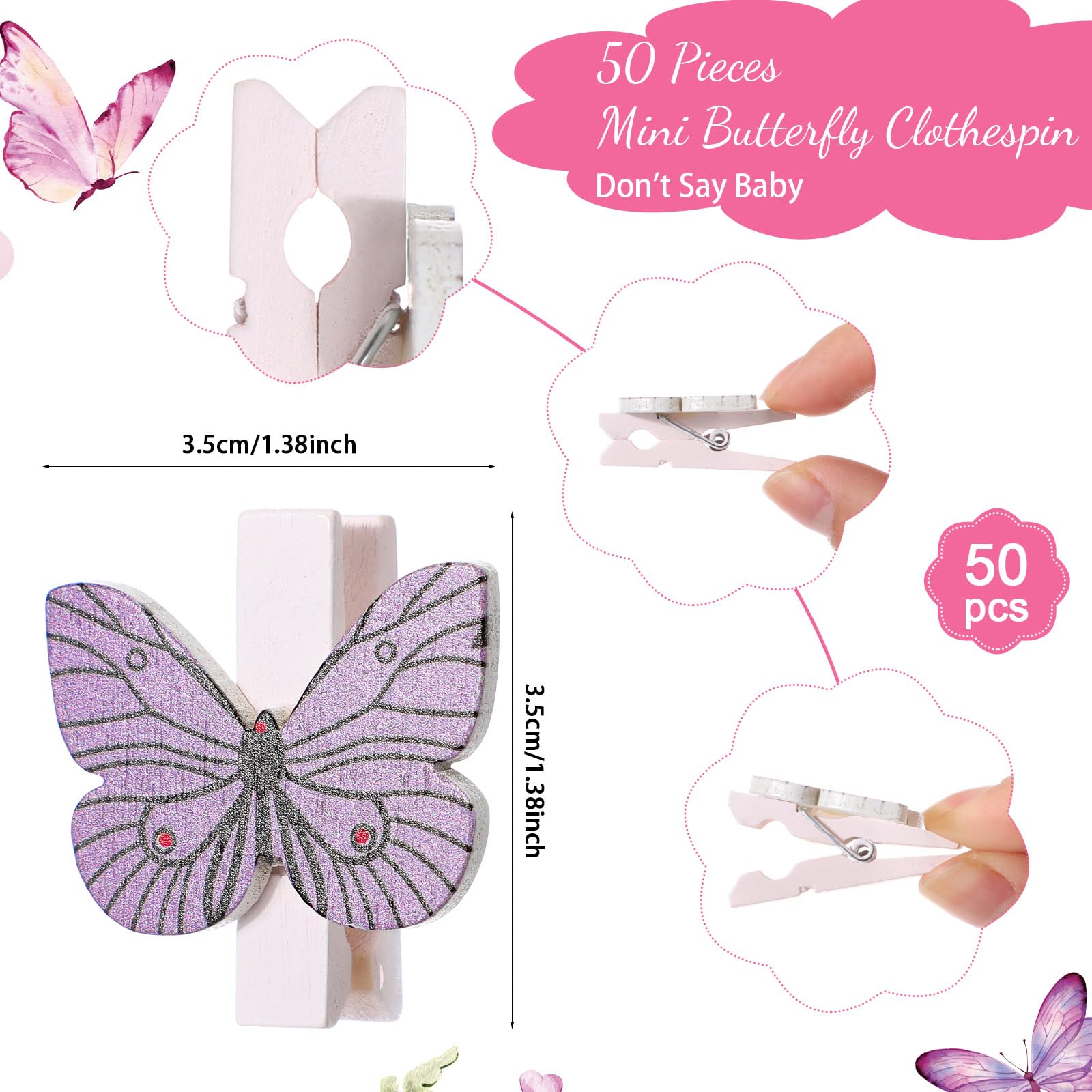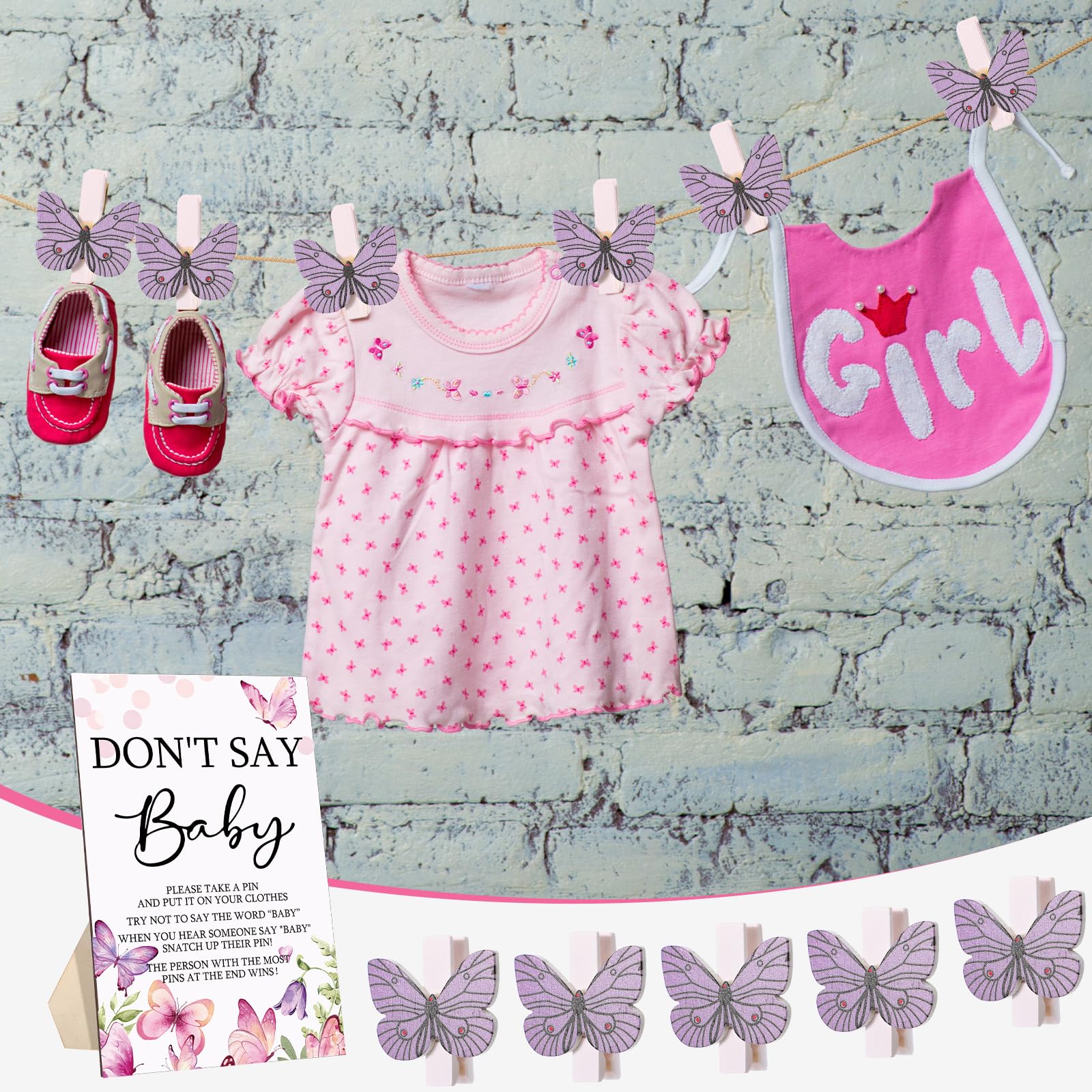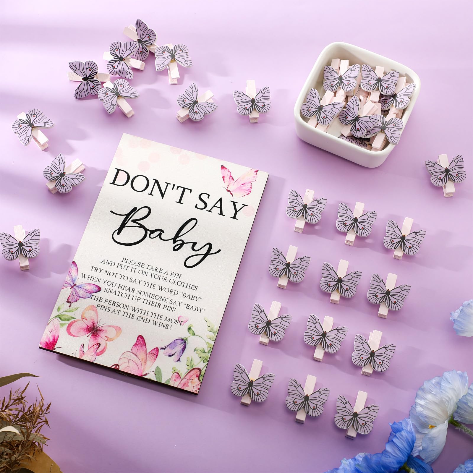What Will Get: the package contains 1 set of don't say baby game supplies, including 1 piece of purple butterfly theme wooden don't say baby sign, 50 pieces of butterfly wooden clothespins, enough and complete to meet your party needs