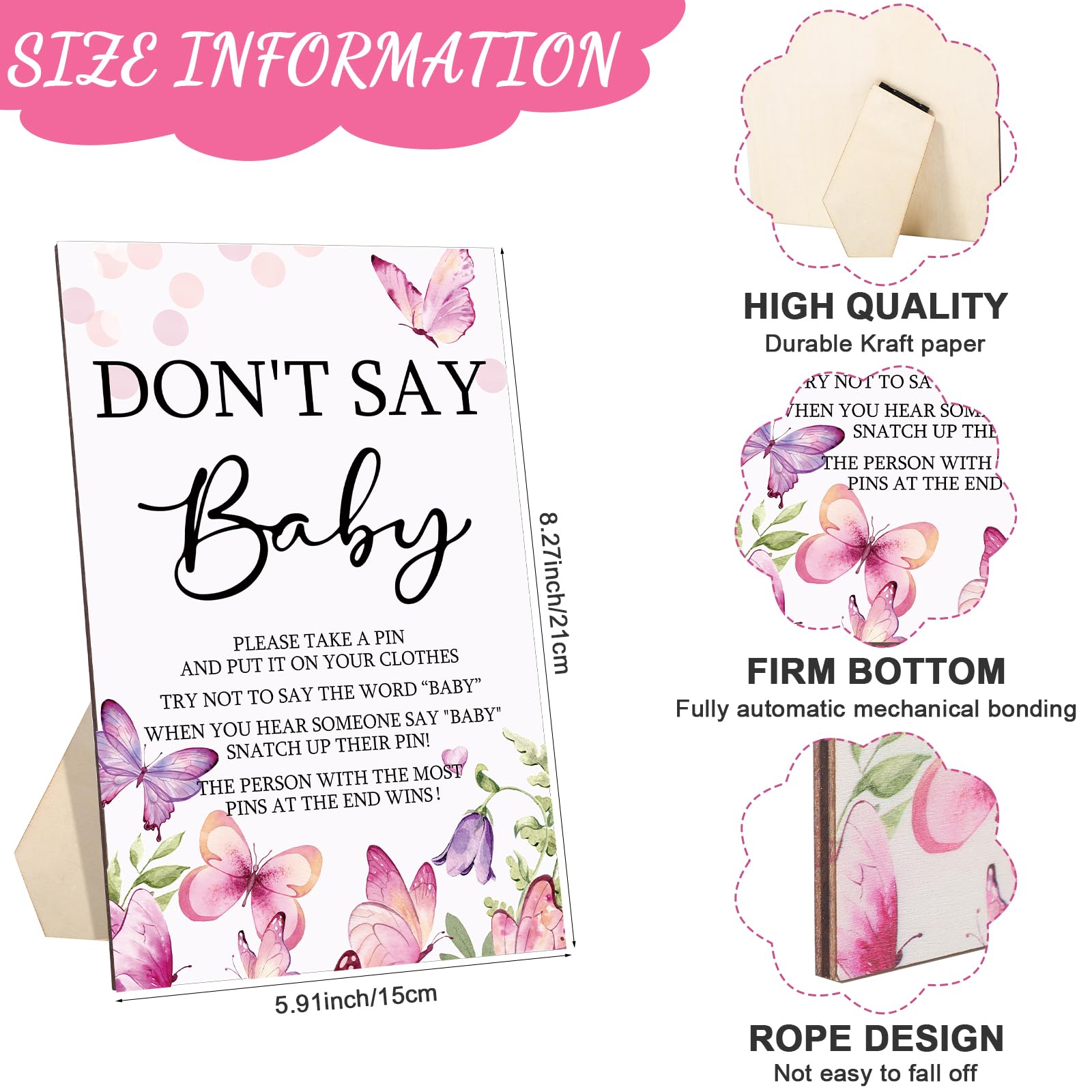 Size Details: the stand sign of this purple butterfly theme don't say baby game measures approx. 5.12 x 7.87 x 0.2 inch, each mini butterfly clothespin is about 1.18 x 0.28 inches, the proper size for you to decorate your party