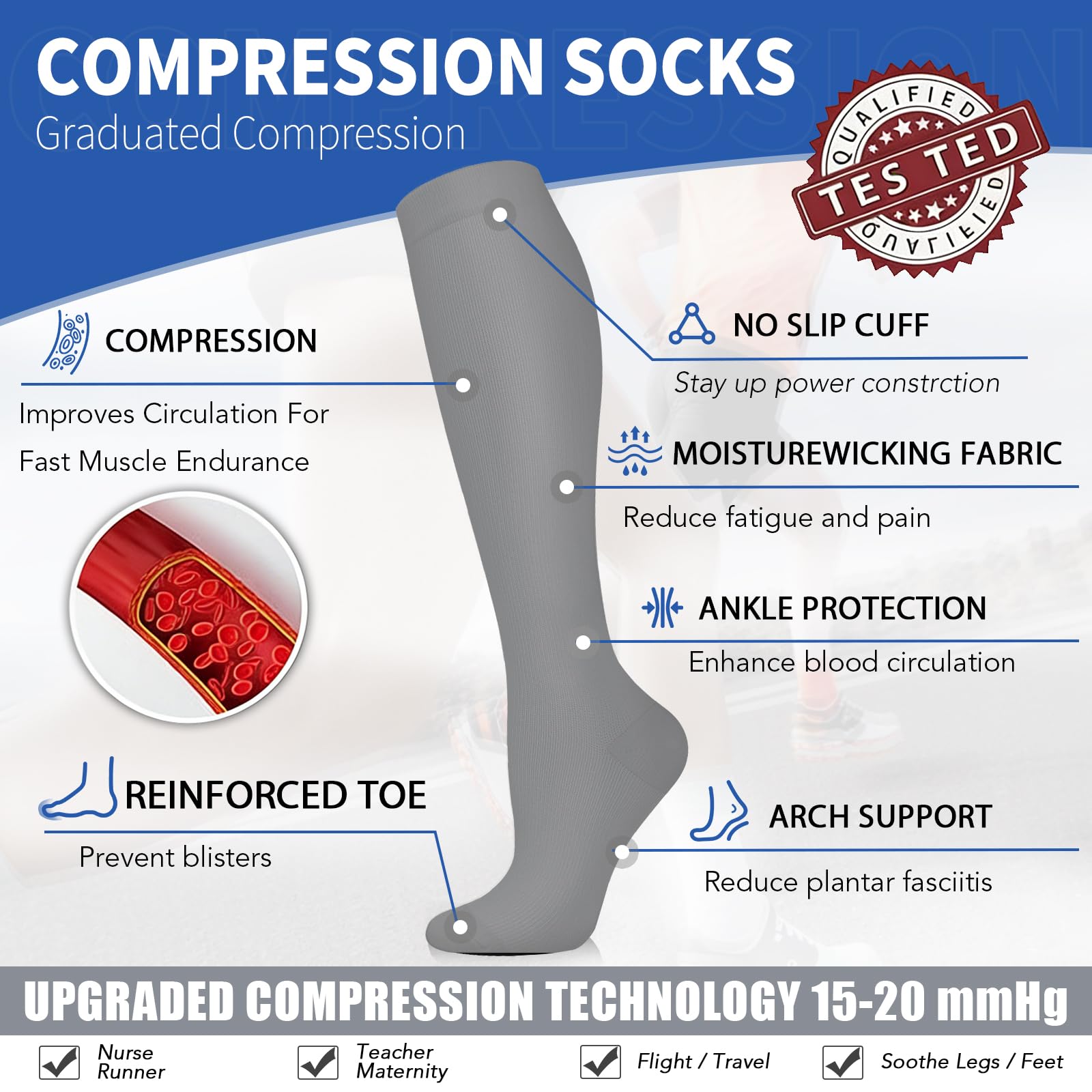 Reduce Injuries - Provide mild squeezing for warmness and enhance blood moving through your legs. Remove stress and stimulate every cell, relieves symptoms varicose veins and excess fluid retention. Help relieve pain & discomfort related to plantar fasciitis, Provides true graduated compression to support your legs, reduce fatigue, soreness, cramping and prevent injuries at the same time.