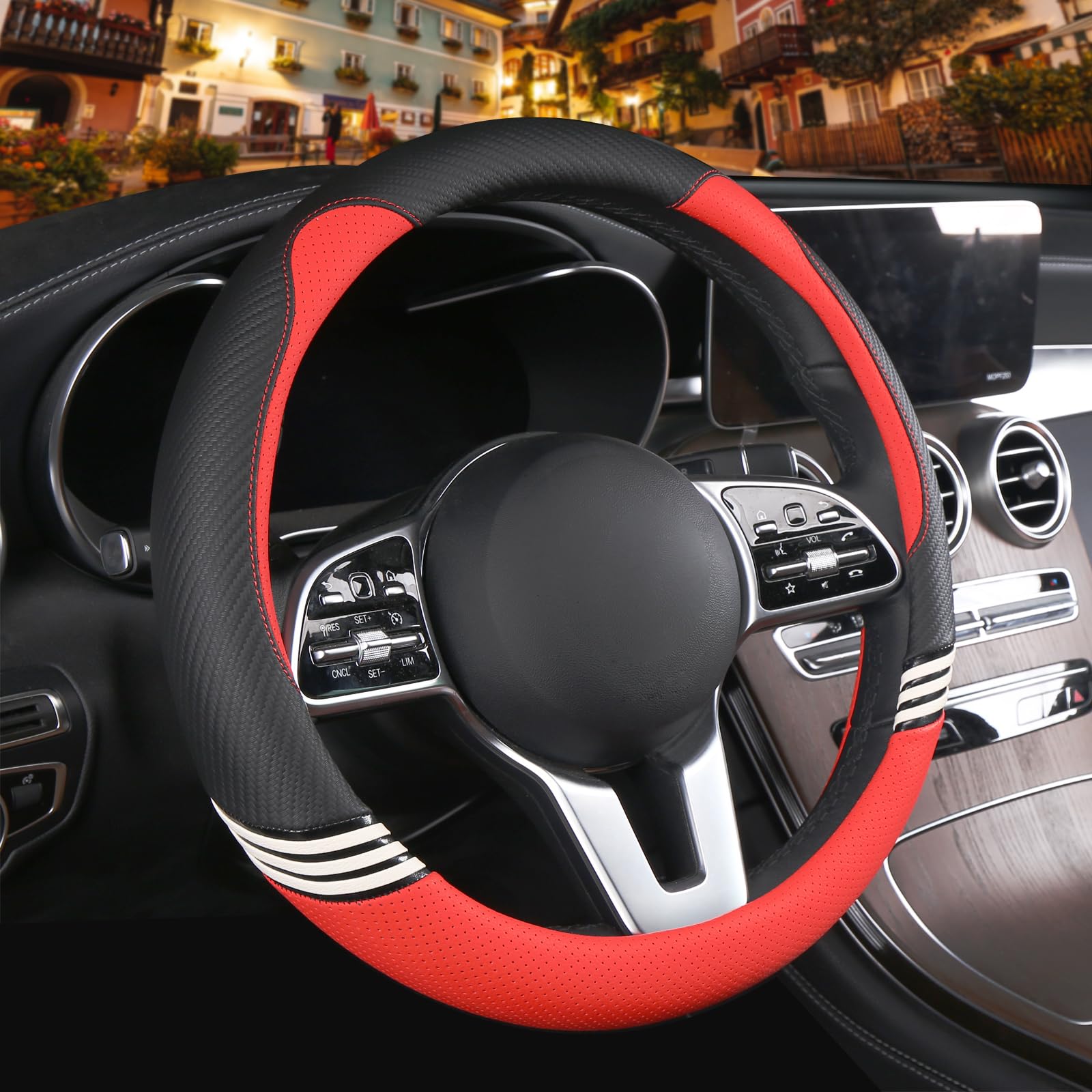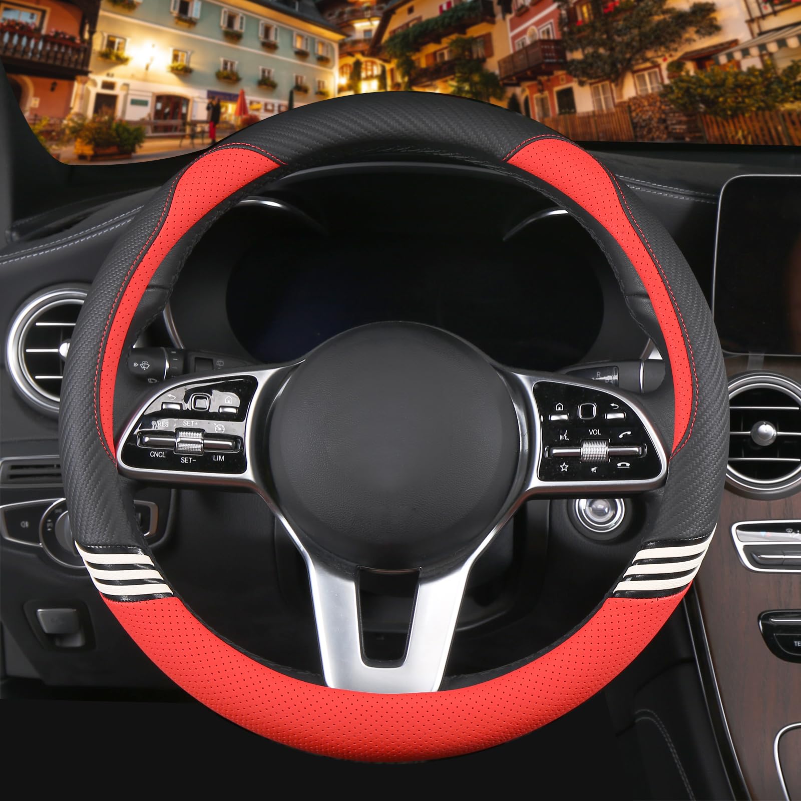 [FOR ALL SEASONS] - This steering wheel cover is crafted from a combination of soft, breathable leather and premium carbon fiber material. It offers heat resistance, cold resistance, and abrasion resistance, ensuring more stable temperature performance. Available all year round, eliminating the hassle of replacement.