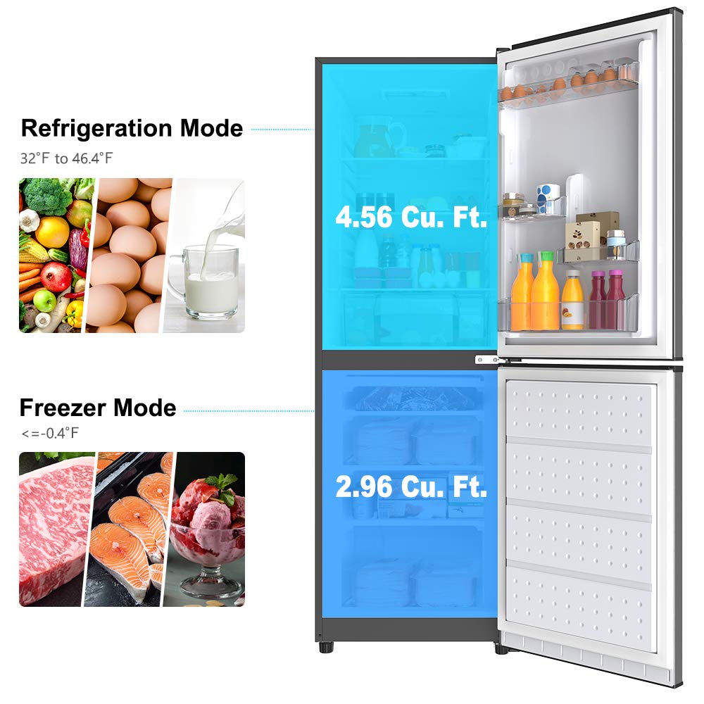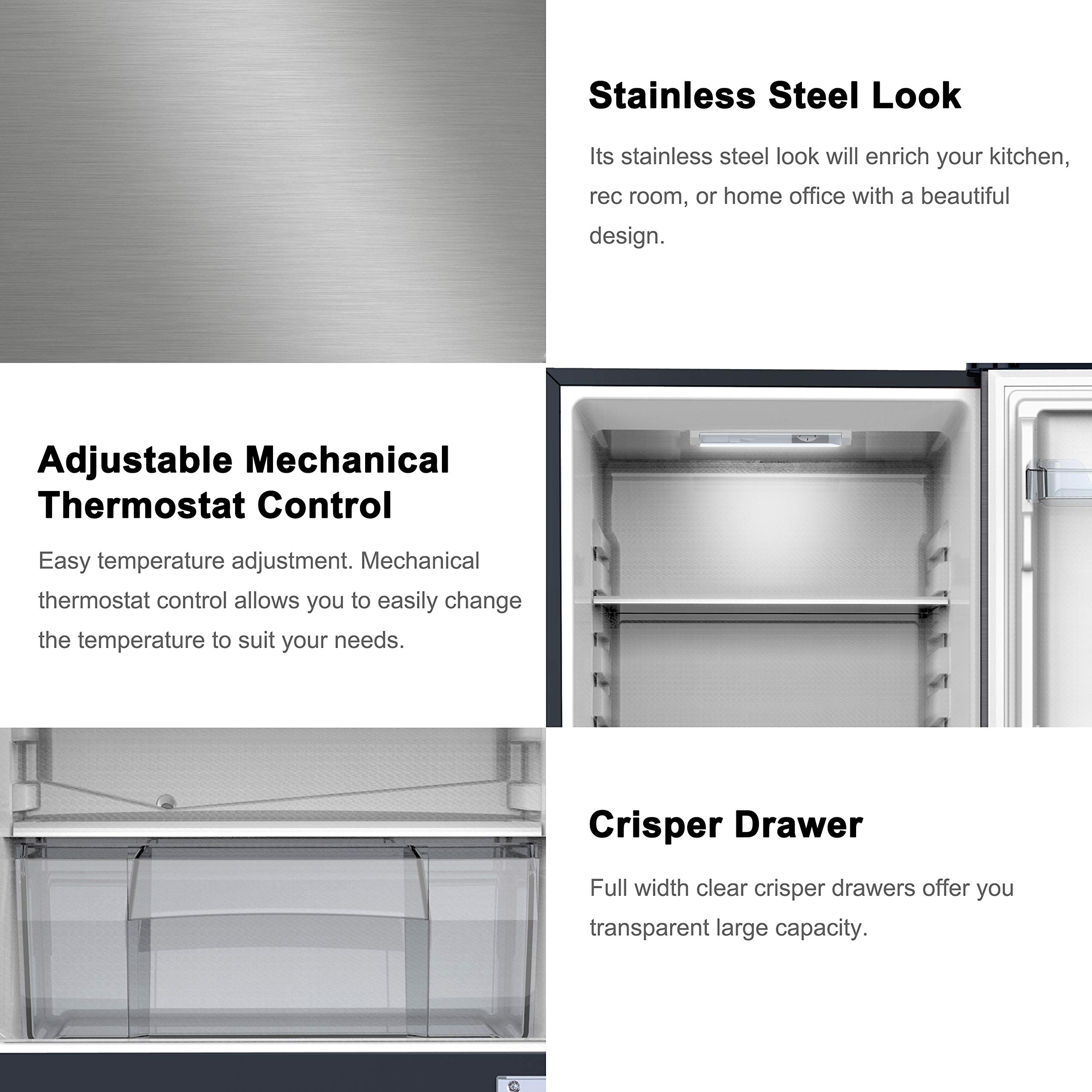 Product Features: Stainless Steel Look Adjustable Mechanical Thermostat Control 1 Crisper Drawer 3 Full Slide Out Glass Shelves Bottom Freezer Compartment Versatile Door Storage Interior Light 2 Leveling Front Legs Specifications: Size: 7.4 Cu.Ft. Style: Without Installed Ice Maker Color: Stainless Steel Package Includes: 1 X Refrigerator 3 X Removable Glass Shelves 1 X Crisper Drawer 1 X Grounding Wire 1 X Grounding Plug 1 X Power Cord 1 X User’S Manual.