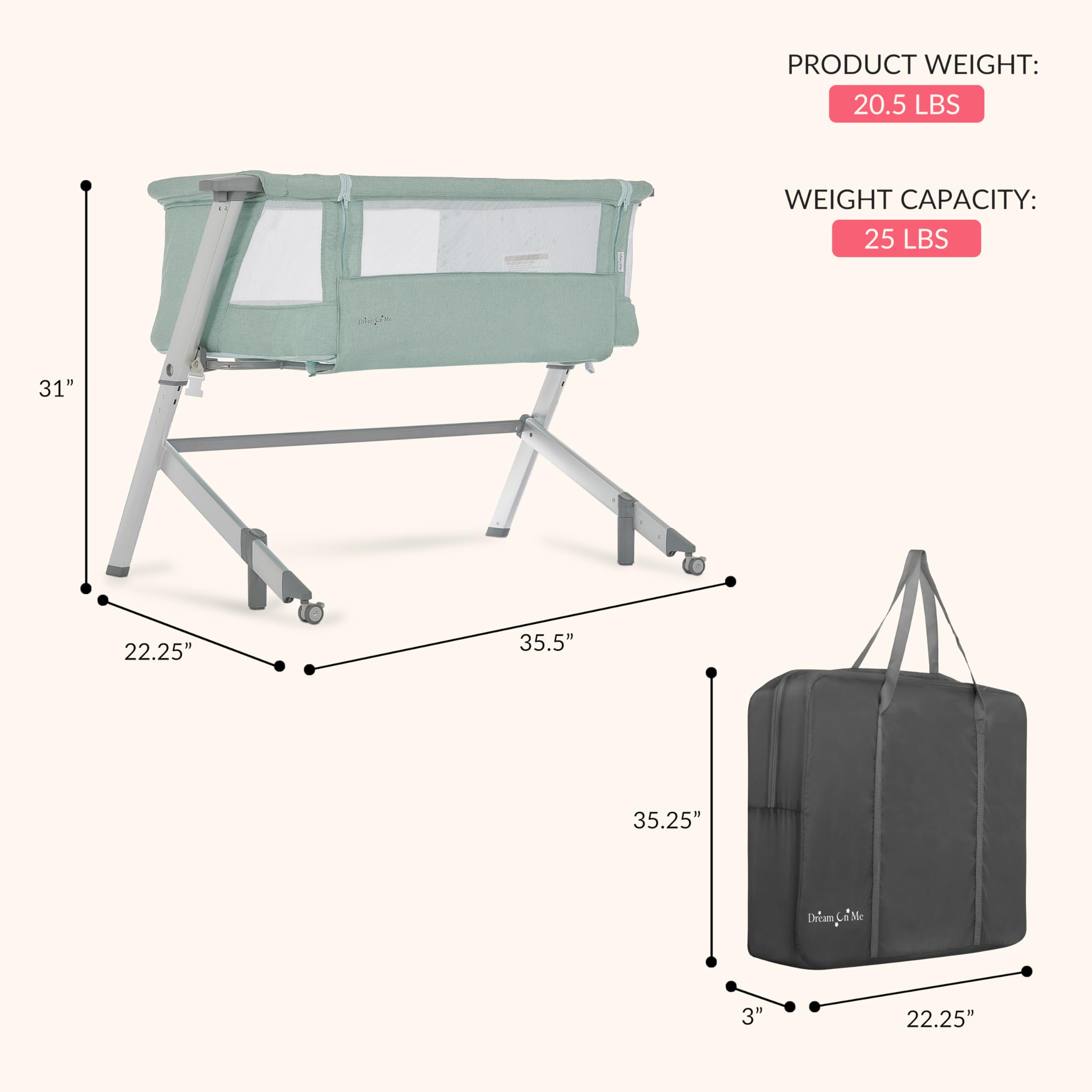 Thoughtfully built, the Skylar Bassinet & Bedside Sleeper is ideal for the first few months of parenthood. Weighing a little under 19 pounds, the Skylar is lightweight and portable, making it ideal for small spaces. Use it as a bedside sleeper - the legs fold inward, getting it close to the mattress. Wheels on the front legs allow easy adjustability. The sturdy strap system allows you to easily secure the Skylar to your bed frame. The mesh sides, which can be zipped down, allow easy viewing of your baby and ensure full breathability. Lean in for breastfeeding or comforting your child through a restless night! The five-adjustable height mechanism (13 - 17.3″) accommodates all types of beds leaving no gaps and is also easy on your back. Set-up is quick, thanks to a tool-free assembly. The Skylar is available with aluminium frames. It comes in fantastic colors, allowing it to blend in beautifully with your nursery! The Skylar meets all ASTM standards. It comes with the regulatory 1-inch mattress pad (34.5L x 20.5W x 1H inches) and is recommended for babies up to 25 lbs or 6 months of age. Bassinet dimensions are 35.25L x 22.25W x 30.5H inches. Weighs 18.65 lbs.