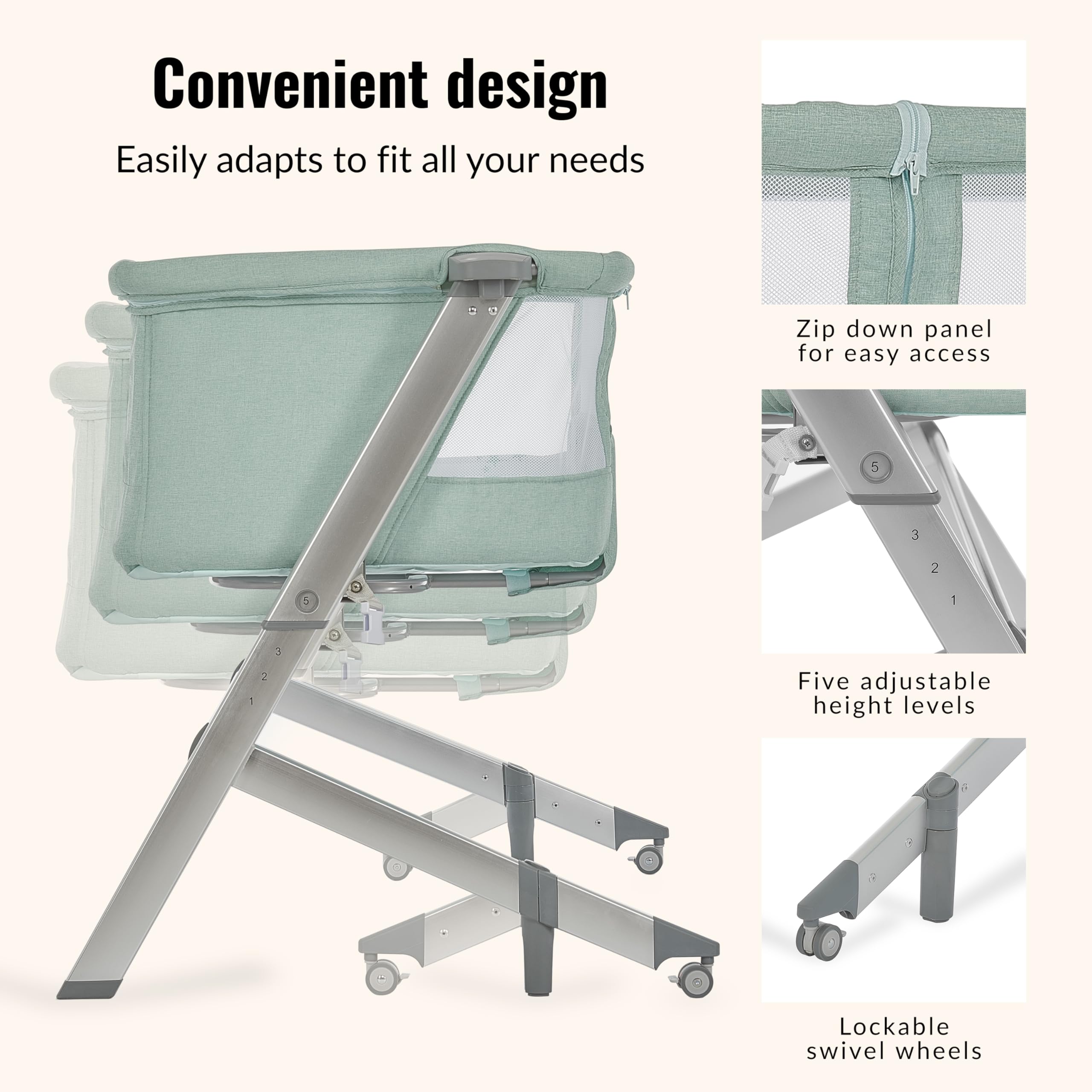 DUAL USE: Unzip and roll down the mesh sides to convert the bassinet into a bedside sleeper. Lean in for breastfeeding or comforting your child. Five adjustable heights (Adjusts from 26.5 > 27.5 > 28.5 > 29.5 > 30.5”) Able to be used with a queen mattress leaving no gaps and is also easy on your back