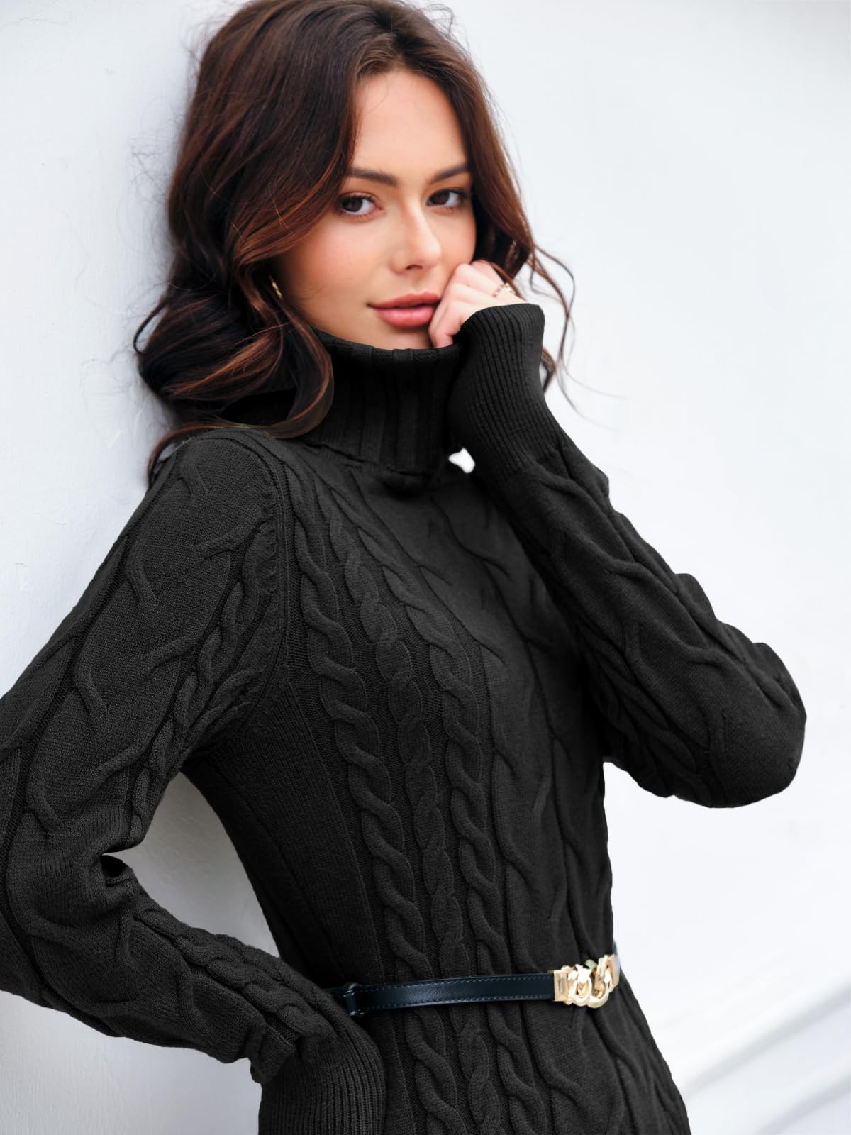 Style: women's turtleneck long sleeve sweater dress / women's cable knit sweater dress / slim fashion sweater / half body sweater dress / fall sweater dress / knitted sweater dress / feel super soft / solid color / casual style