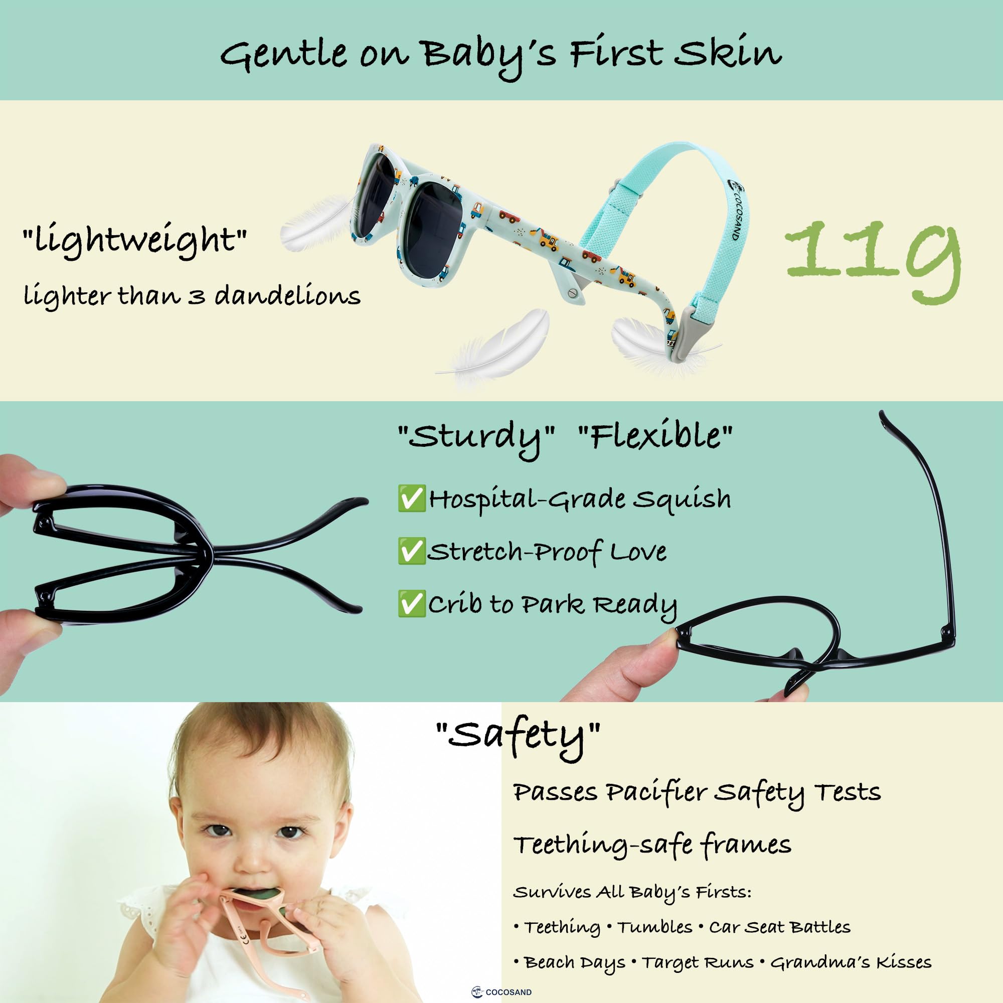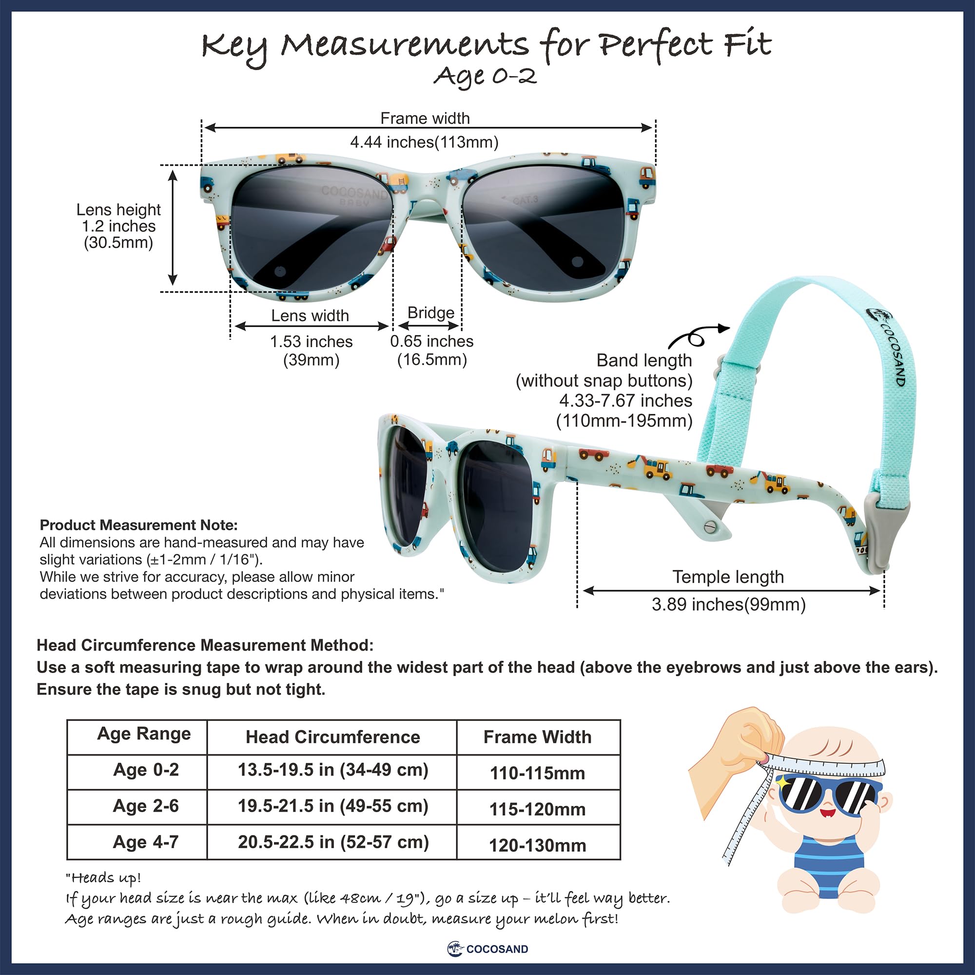【Perfect Fit for Growing Babies】:Our infant sunglasses fit babies with head circumferences up to 48cm. The adjustable temple and 110 - 195mm strap mean a custom fit for every stage. Whether your baby boy or baby girl is growing fast, these sunglasses grow with them