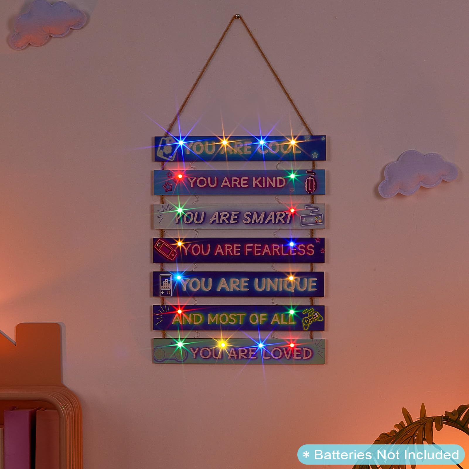 Package: The play room decor for kids package includeds 1 pcs girls room decor board, 1 pcs LED light with empty battery box (not including batteries), 1 pcs remote control (not including batteries), both do not including batteries, need to be purchased by customers themselves