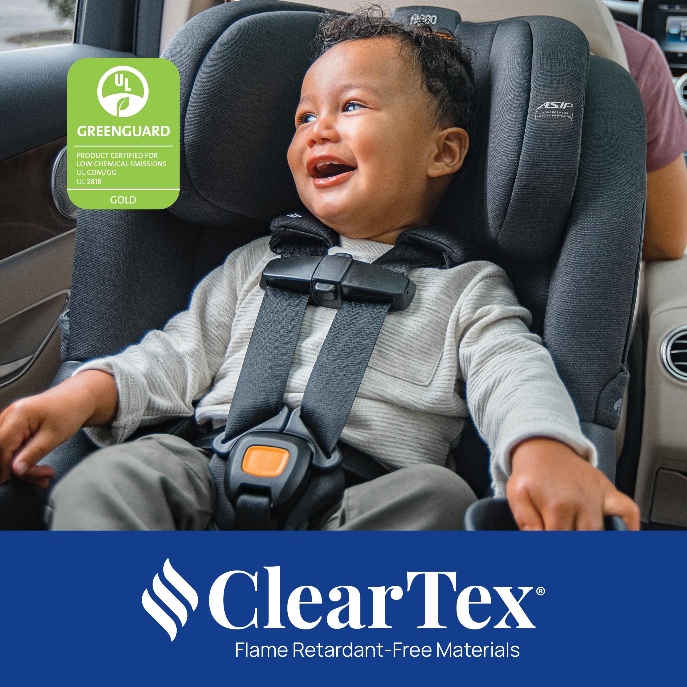 Make Every Day Easier The Fit360 ClearTex Rotating Convertible Car Seat is the all-around easiest-to-use rotating car seat, thoughtfully designed to make every day travel easier. The 360Β° one-hand rotation provides an optimal experience to comfortably secure your child in the seat and just as comfortably remove them from the seat when your ride is complete. Built to bring your child closer to you when buckling and unbuckling, Fit360 is also enhanced with an innovative Quick Secure Harness System including a magnetic chest clip, flex-forward buckle, 15-position easy-adjust headrest and easy-flow harness. The Fit360 provides the all-around best 360 car seat experience starting face-to-face for easy loading and unloading, and then turning to rear-facing or forward-facing when youβre ready to ride. Install with Confidence Installing the Fit360 into your vehicle is as simple as open-route-close with innovative LeverLock seat belt installation. Open the LeverLock door on the Fit360 base and route the seat belt using the easy-access belt guides. The built-in LeverLock self-tensioning lock system offers superior stability with three points of contact for continuous use from rear-facing through forward-facing usage. By closing and latching the LeverLock door, the vehicle belt is tightened in a way that eliminates any movement from front-to-back or side-to-side. This provides a secure installation with minimal effort, ensuring reliable stability over time. Two RideRight bubble level-indicators work in tandem with the 6-position ReclineSure leveling system to provide improved vehicle fit and child comfort. Visual red and green indicators assure the Fit360 is installed securely in your vehicle and is in either a rear-facing or forward-facing ready-to-ride position. Everyday Comfort The ergonomic seat shell combined with the ultra-plush seat pad, supports your child in a natural seated position and provides enhanced comfort as they grow. The Fit360 base is equipped with six recline positions that allow you to select the ideal seating angle during installation that will provide peace of mind throughout the duration of use. Featuring ClearTex flame retardant-free materials, Fit360 rotational car seat is GREENGUARD Gold Certified for low chemical emissions, contributing to healthier air quality around your child. Everyday conveniences include machine-washable fabrics for easy cleaning and two flexible, removable dishwasher-safe cup holders. Everyday Ease The quick-secure harness system features a 15-position, easy-adjust headrest that, when adjusted, simultaneously also adjusts with the harness height. The flex-forward crotch buckle stays auto-positions to ensure it is out of the way for easy child loading and harness pockets keep straps and buckles contained until ready for use. The quick-secure magnetic chest clip offers easy in and out without the fuss. Everyday Protection Fit360 includes a steel-reinforced shell and sculpted EPP energy-managing foam. A removable body support for newborns (4-11 lbs.) makes the Fit360 ready to go from day one. Featuring Advanced Side Impact Protection (ASIP), Fit360 is engineered to meet the Federal Motor Vehicle Safety Standard FMVSS 213a β Side Impact.