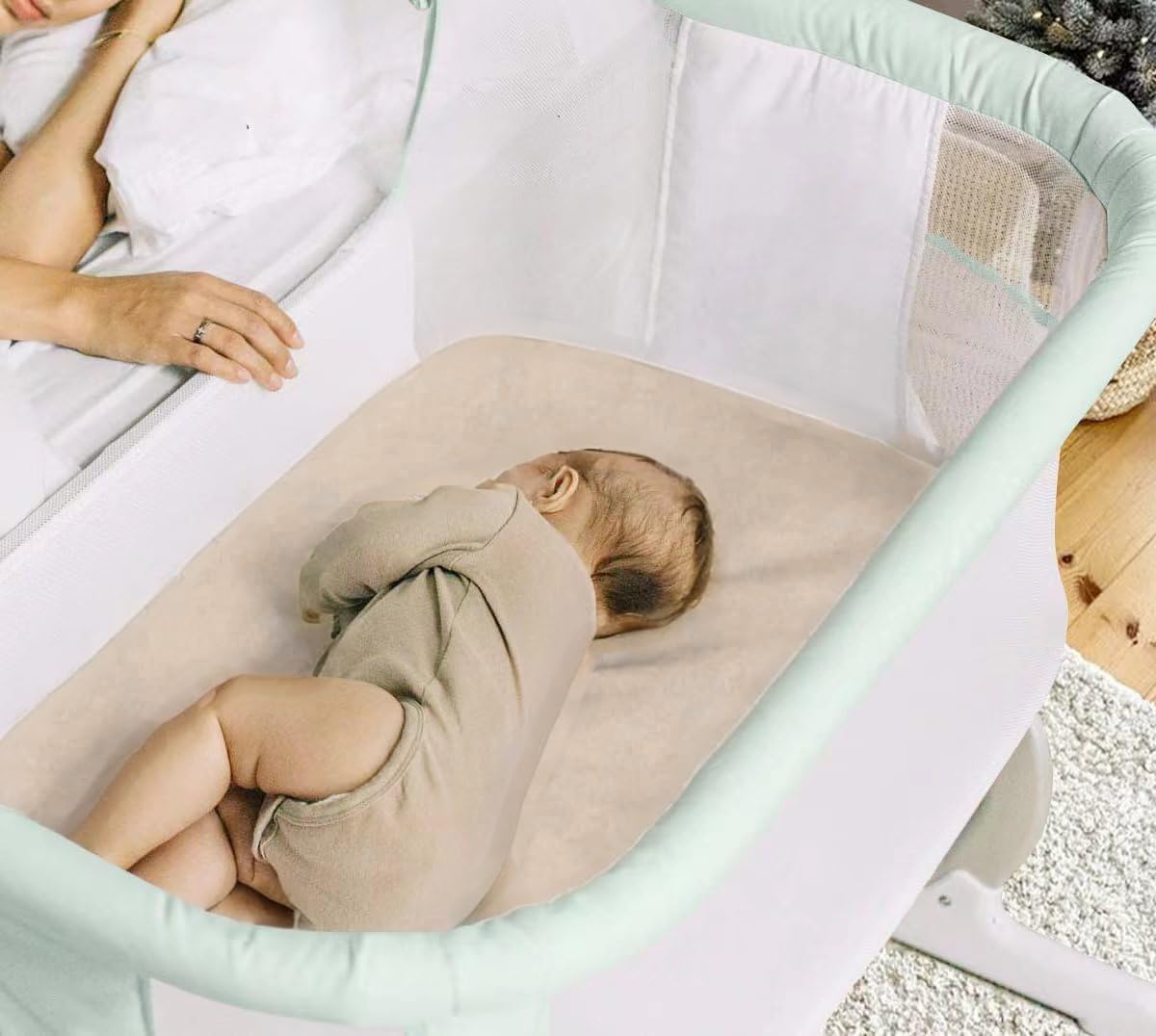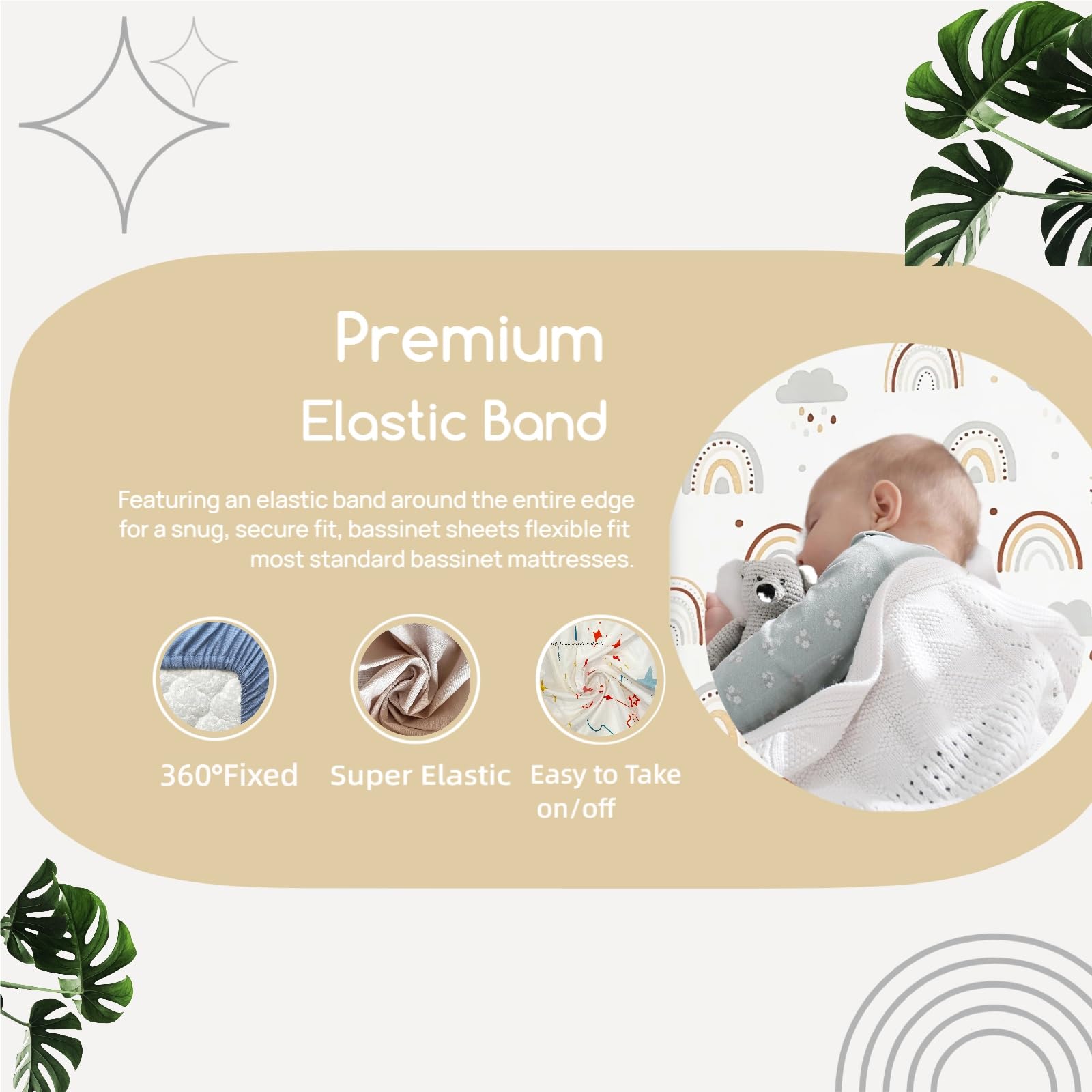 Our bassinet fitted sheets are made of 100% premium polyester for naturally stretchy. With an elastic band around the entire edge for a snug, our bassinet sheets are compatible with most rectangular bedside bassinet sleeper and crib mattress with different size. We do really hope your baby love the delicate touch and enjoy sleeping during the day and night!