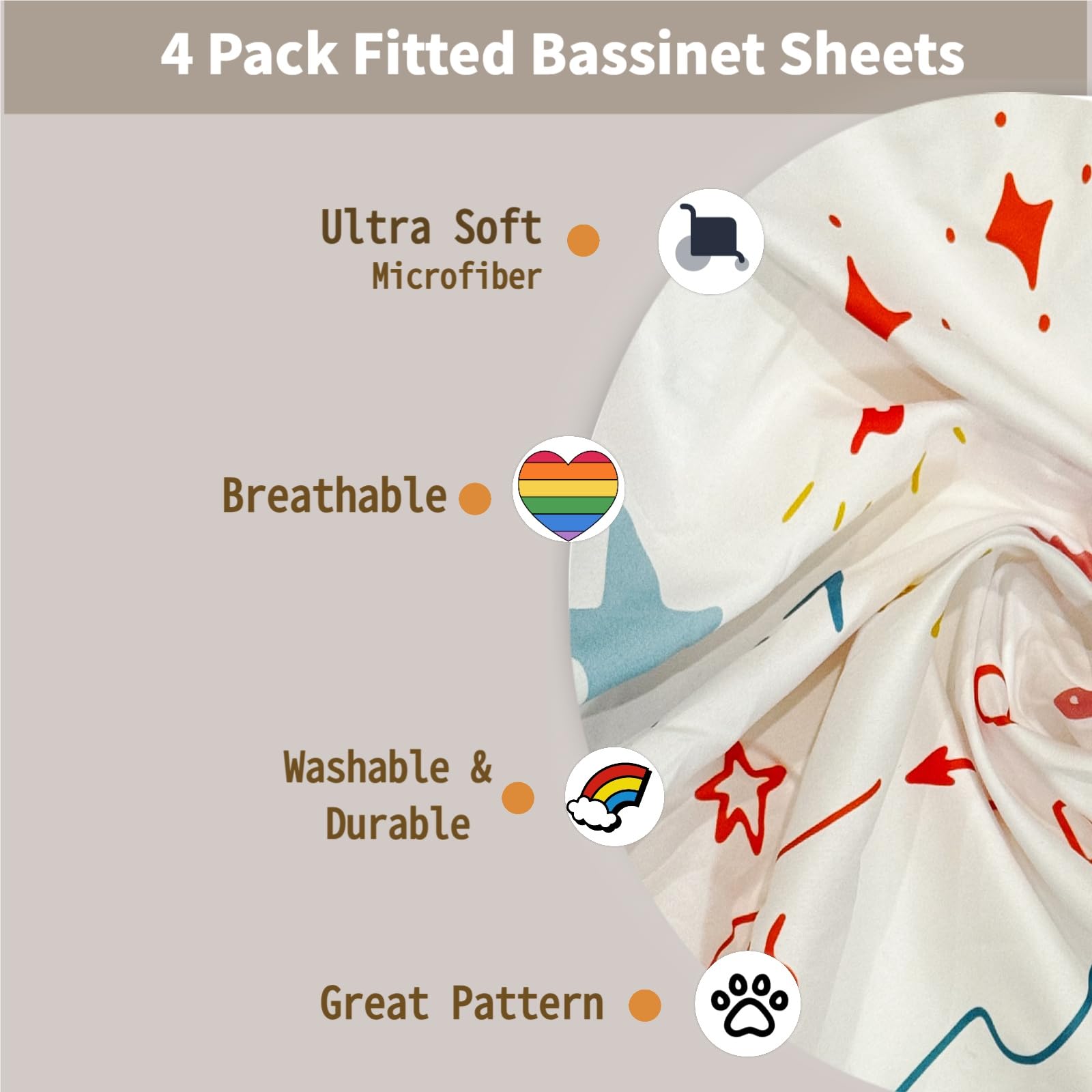 PREMIUM QUALITY - Our bassinet fitted sheets are made of 100% premium polyester for naturally stretchy, highly breathable, keeping your bassinet or crib cool and dry. Besides, the flat surface of sheets make your little one feel comfortable with the delicate touch. Some noisy plastic sound will never happen to disturb your baby during the sleeping.