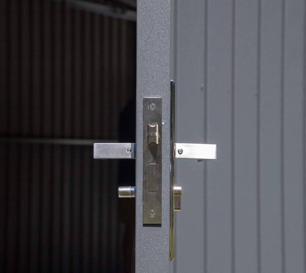 PREMIUM GARAGE FEATURES: Extra-tall 94" high walls, an 8'x7' sectional garage roll up door, brushed metal hardware. Features a secure key lock handle to keep your stored items safe and secure