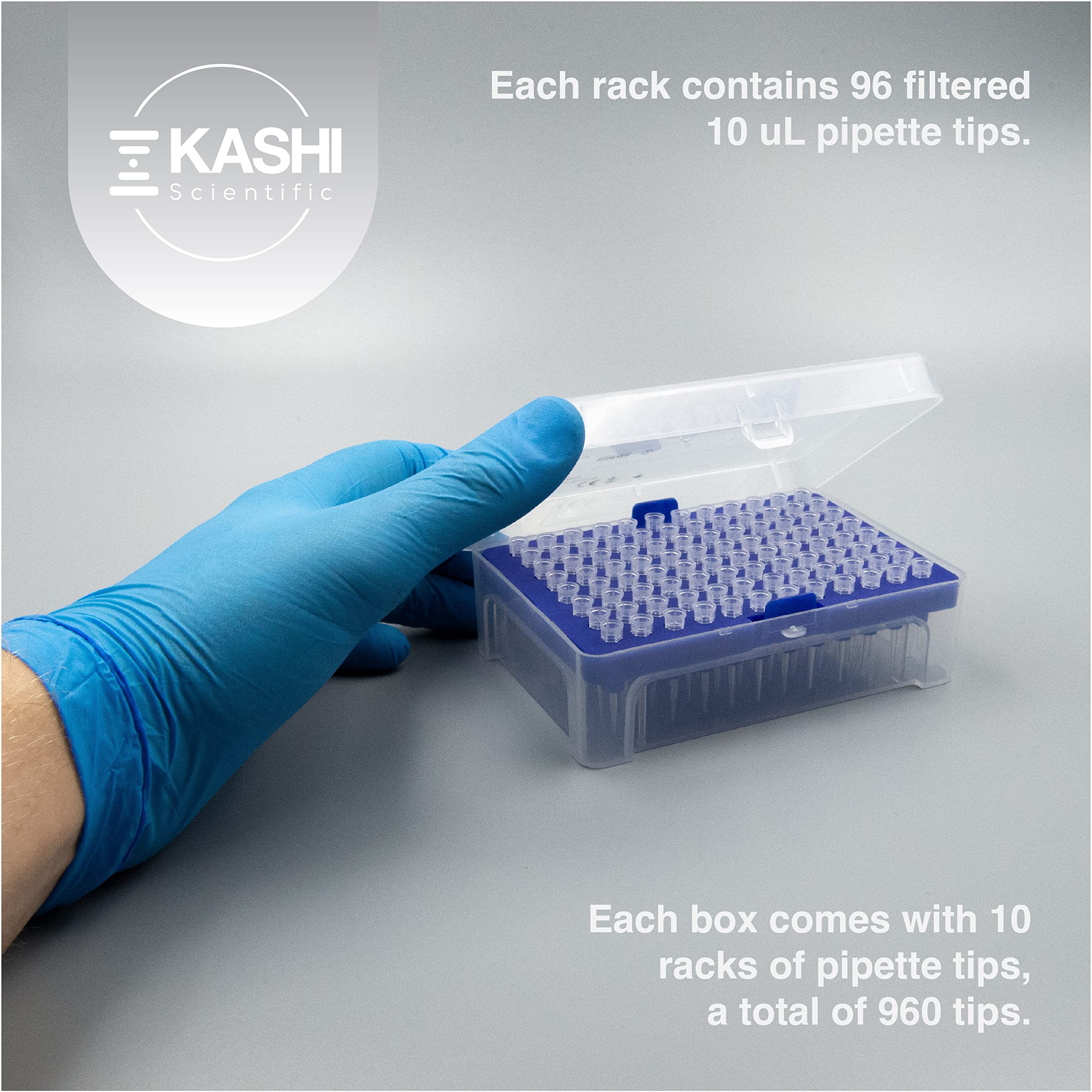 Durable polypropylene pipette tips are sterilized and individually wrapped in racks of 96 tips