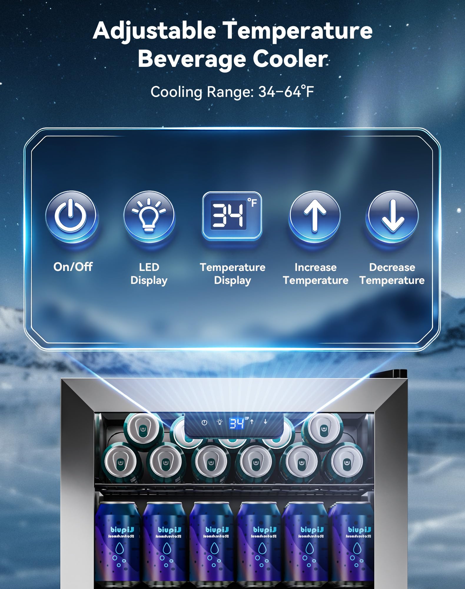 Smart Temperature Control (34°F - 64°F): Take full command of your drink’s freshness with our intuitive digital interface. Whether you prefer crisp, bone-chilling sodas at 34°F or perfectly tempered wines at 64°F, the wide temperature range caters to all your needs. The easy-to-read display provides real-time monitoring, ensuring your beverages are always stored at their optimal flavor profile.