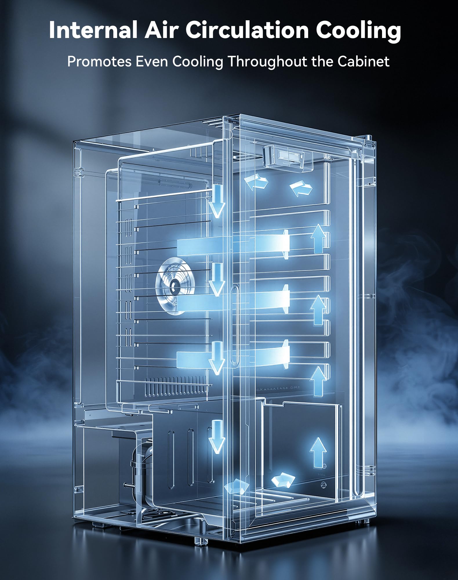 Rapid Cooling Tech & Crystal-Clear Visibility: Experience ice-cold refreshment in minutes. Our advanced cooling system ensures rapid, uniform temperature distribution throughout the entire cabinet, eliminating hot spots. The sleek, transparent glass door paired with soft integrated LED lighting allows you to showcase your drinks and find your favorite beverage at a glance, even in low-light settings, adding a modern aesthetic to any decor.