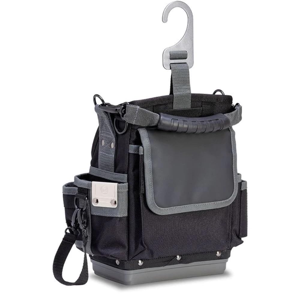 The TP6B is a one-sided, open top compact-sized tool pouch that holds a variety of tools, meters, fasteners & wire nuts. The exterior pockets include a weather resistant rear storage area ideal for sensitive probes. The TP6B features a wide open interior that can be reconfigured via the included, removable V-SWAP Front Tool Panel featuring 3 pockets and an elastic tension strap. Remove this V-SWAP panel to gain more bulk storage capacity for larger items or parts boxes. The TP6B is for techs needing a compact bag for service calls requiring just the minimum amount of tools.