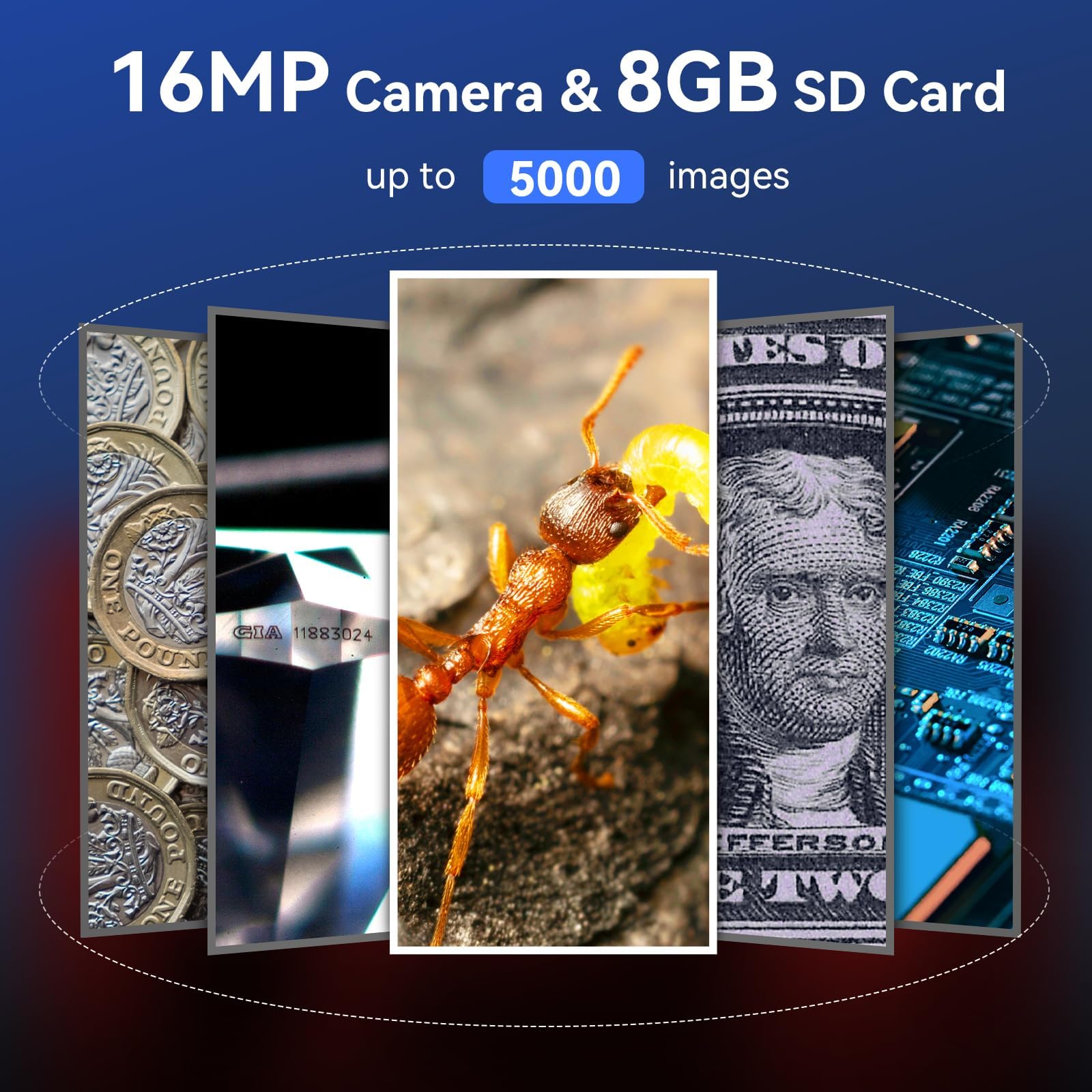 16MP Camera & 8GB SD Card: Capture 16MP images with this mini microscope camera, perfect for detailed research, education, and exploration. Ideal for students, scientists, and hobbyists seeking an immersive microscopic experience