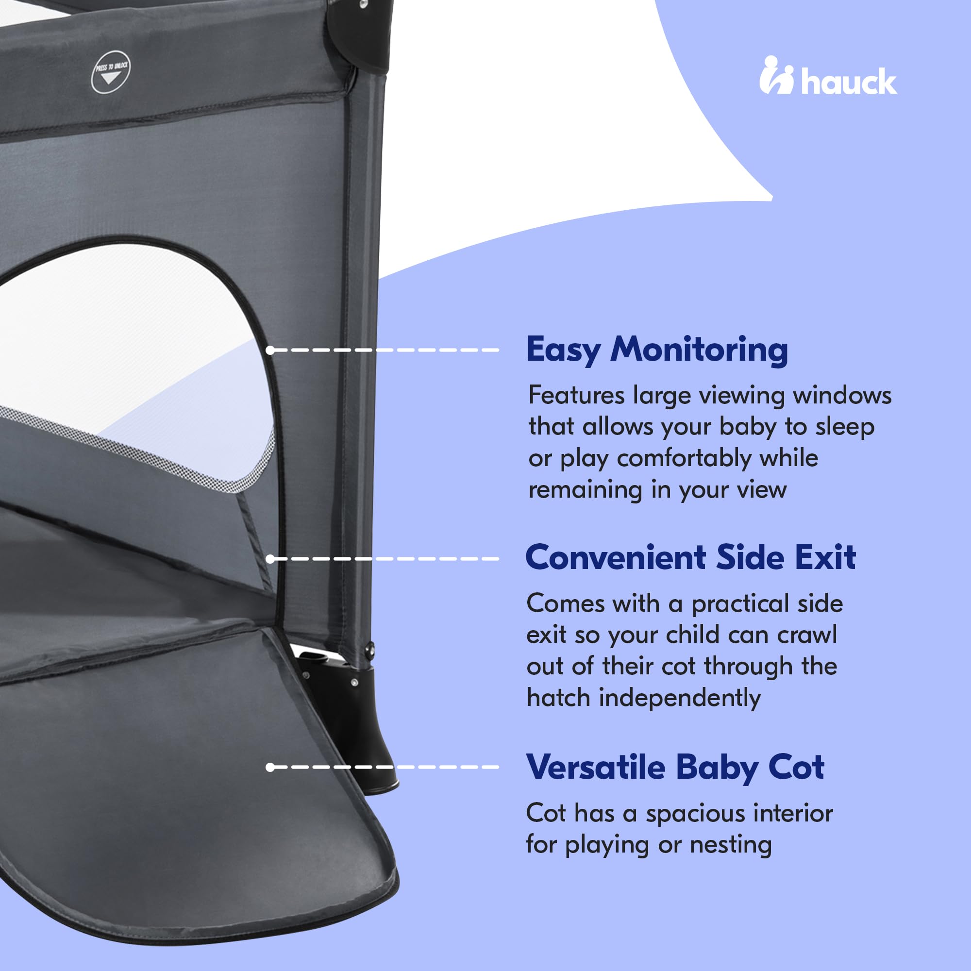 Features large viewing windows that allows your baby to sleep or play comfortably while remaining in your view
