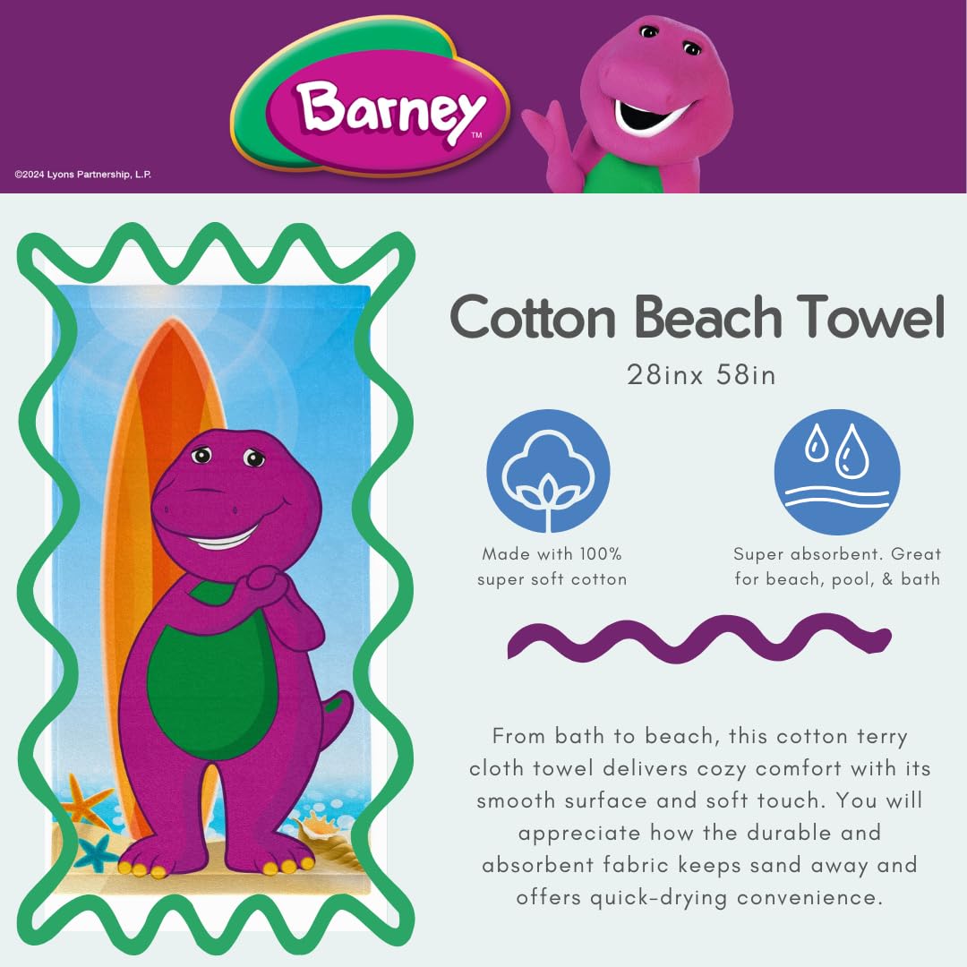 BARNEY DESIGN: Dive into fun with our colorful Barney Beach Towel, featuring Barney standing in front of a vibrant surfboard and ocean backdrop. Made from 100% cotton, this ultra-soft and absorbent towel measures 28"(w) x 58"(l), perfect for bath, pool, or beach adventures. Bring your love for Barney to every splash-filled day!