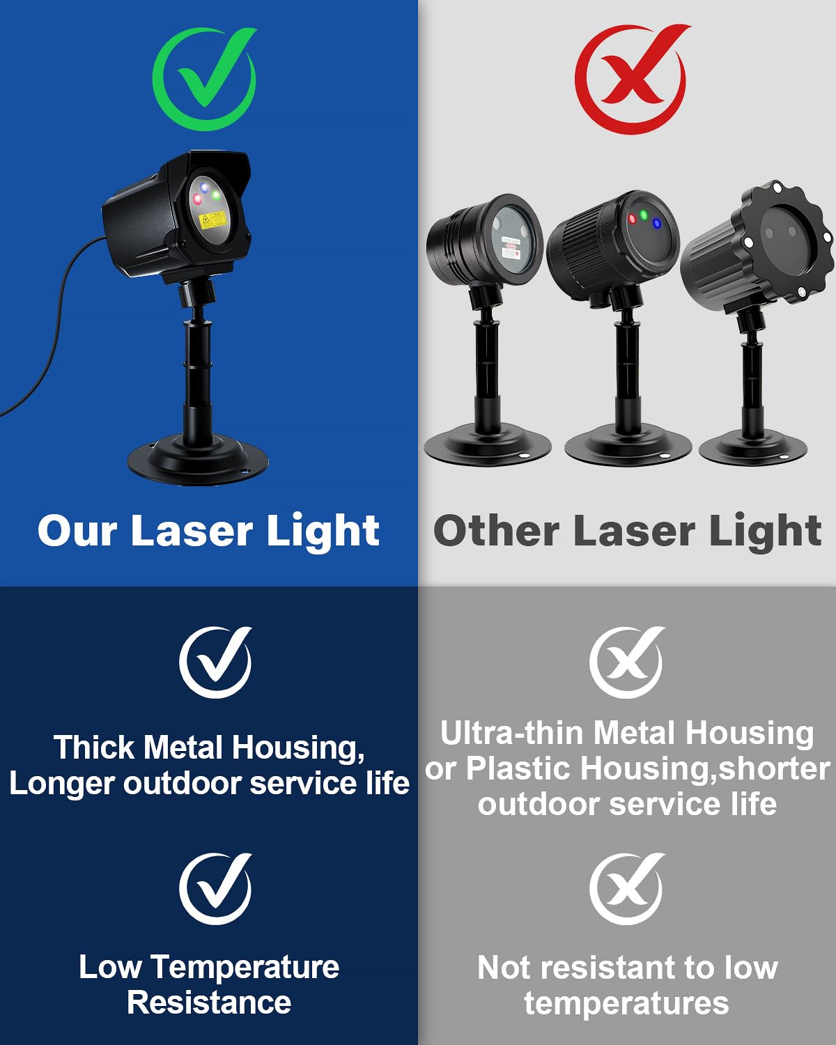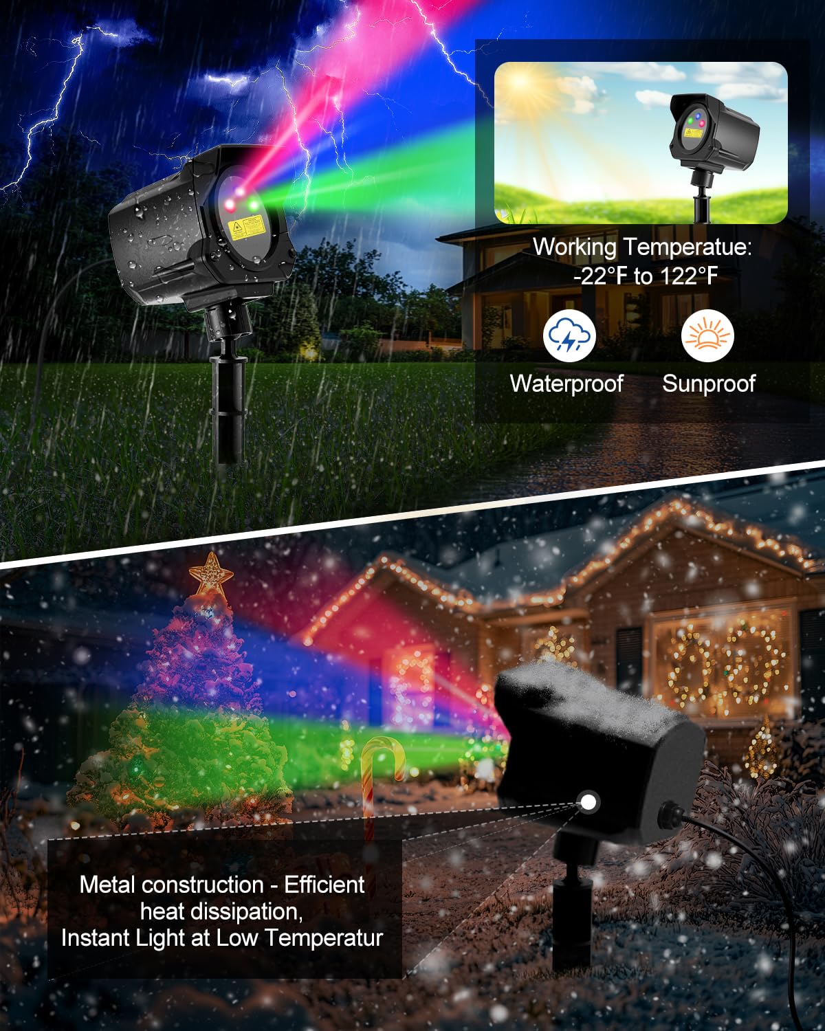 【Instant Light at Low Temperatur】 Featuring advanced temperature protection, our laser light instantly illuminates even in extreme cold, with an operating range from -22°F to 122°F. No need to wait for the lights to warm up—unlike many others on the market. Its IP65 waterproof rating makes it perfect for all weather conditions, ensuring year-round outdoor use.