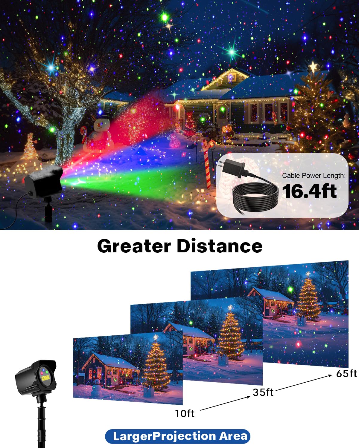 【Larger Projection Area】 With a projection distance of 9.8ft to 65ft, our laser light covers a wider area, enough to illuminate your entire yard or the exterior of your house. While other lights only reach up to 40ft, our adjustable 180° rotatable head allows you to find the perfect distance and angle for the best projection effect.