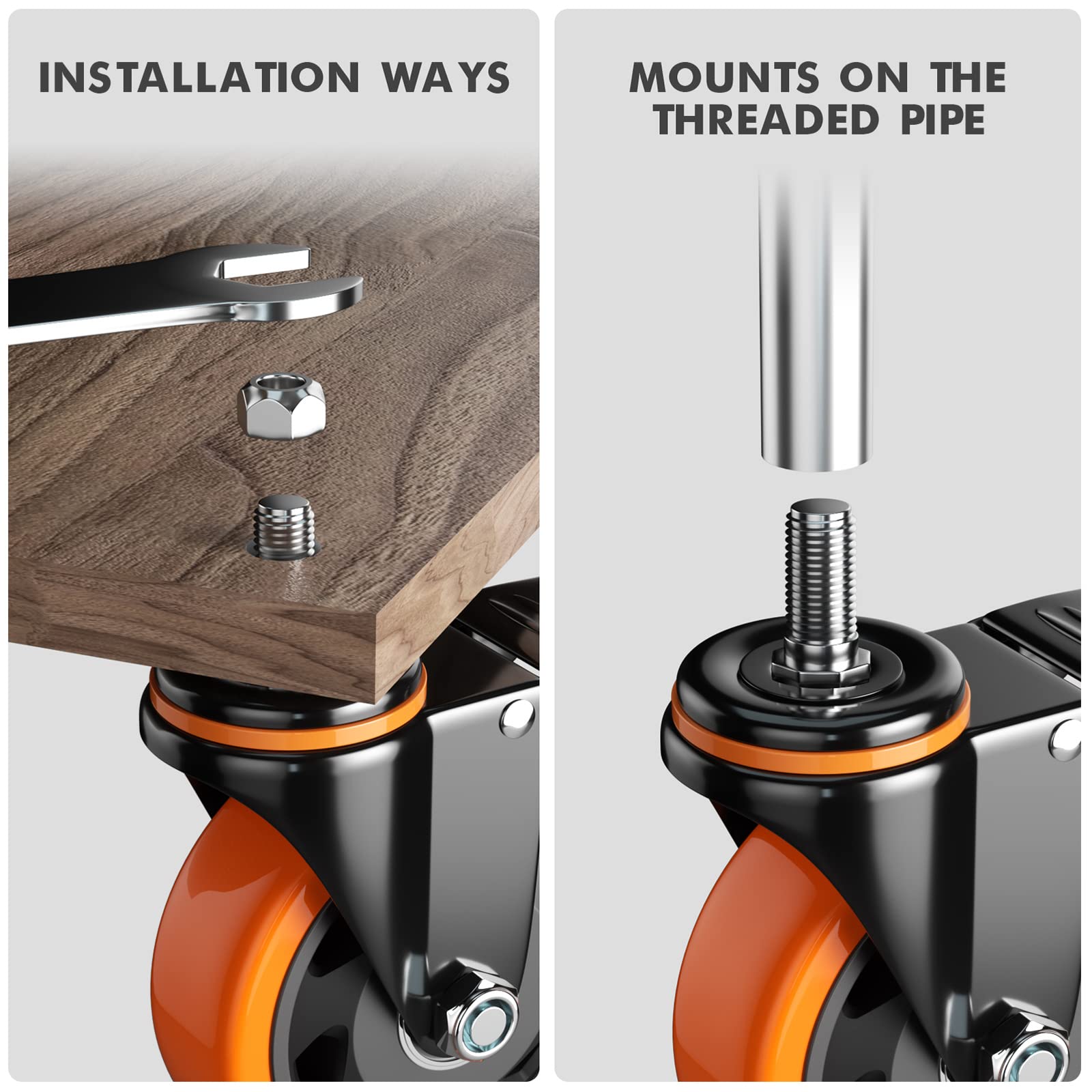 STANDARD AMERICAN SIZE 1/2" -13UNC x 1": Please measure the stem size of your old thread dual locking caster wheels with brakes before purchasing. Our cart wheels screw size is 1/2" -13x1" (Screw Diameter 1/2", Screw Length 1"). The castor wheels are quickly attached to medium and large equipment like workbench, trolley, carts etc.