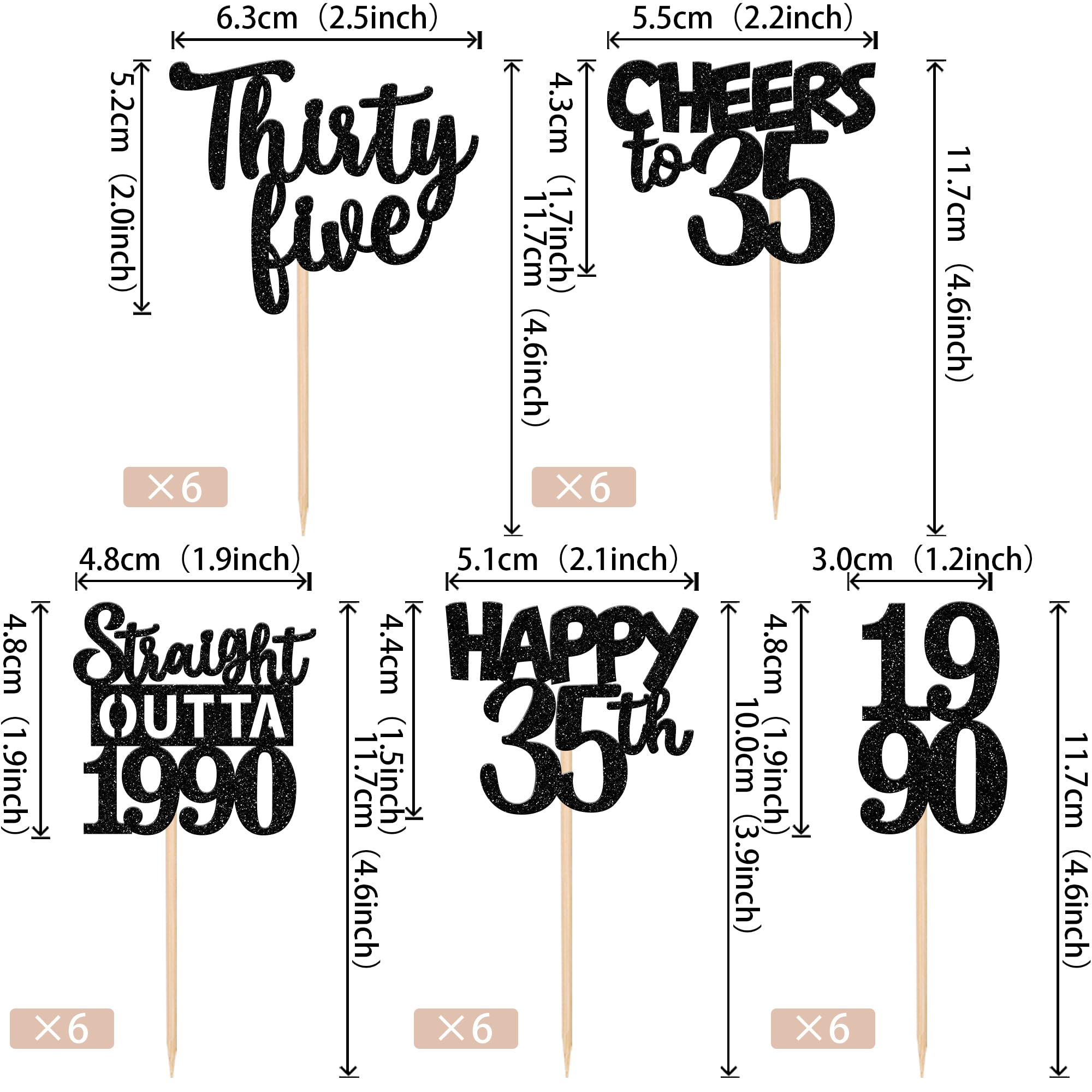 Straight Outta 1990 Cupcake Toppers for Happy 35th Birthday Anniversary Party Cake Decorations Supplies Perfect for happy 35th bithday theme party,straight outta 1990 theme party,35th wedding anniversary theme party,cheers to 35 years theme party cupcake decorations supplies. Pack of 30 pcs,6 pcs of each design The size is 2.5*4.6/ 2.2*4.6/ 1.9*4.6/ 2.1*3.9/ 1.2*4.6 inch ( with stick ) Made of high quality paper card stock,thick and thick and sturdy. These cupcake toppers are single glitter, the back is white, and they are intended for decoration only, please do not put them in oven or microwave. If the item you received has any defects, please contact us immediately. we will deal with it within 24 hours.