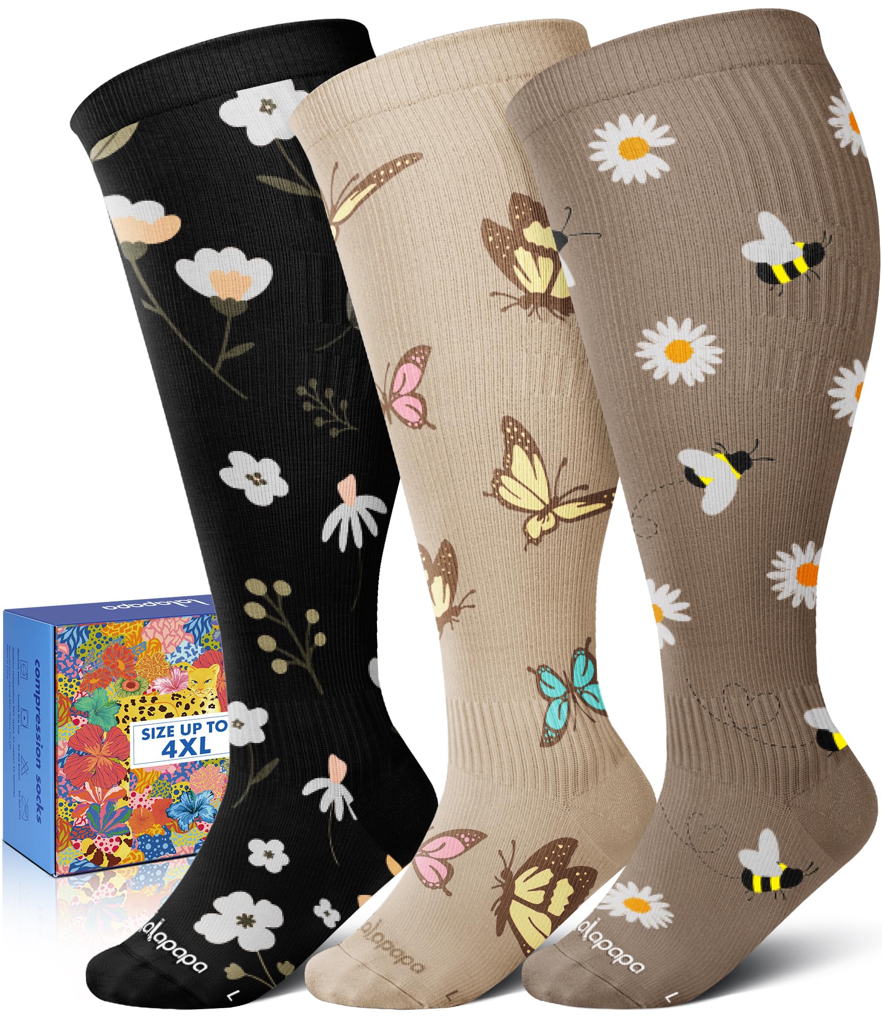 Plus Size Compression Socks Wide Calf: These wide calf compression socks are designed for people with wider calves, providing excellent leg support and long-lasting graduated compression. They are easy to put on and take off and won't roll down or cut into your leg due to their 360° stretchy and wide cuff. They are also durable and comfortable to wear.