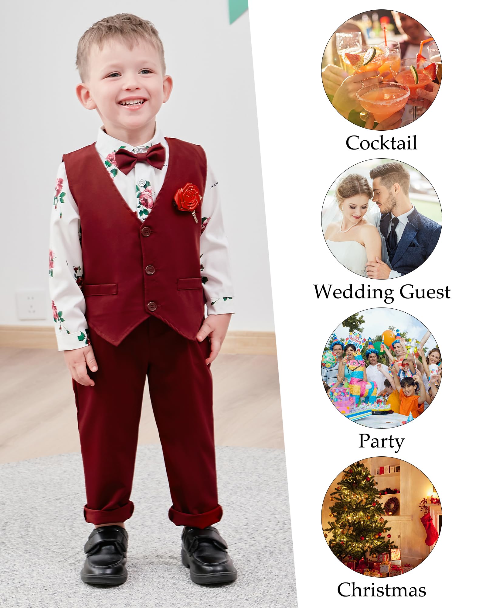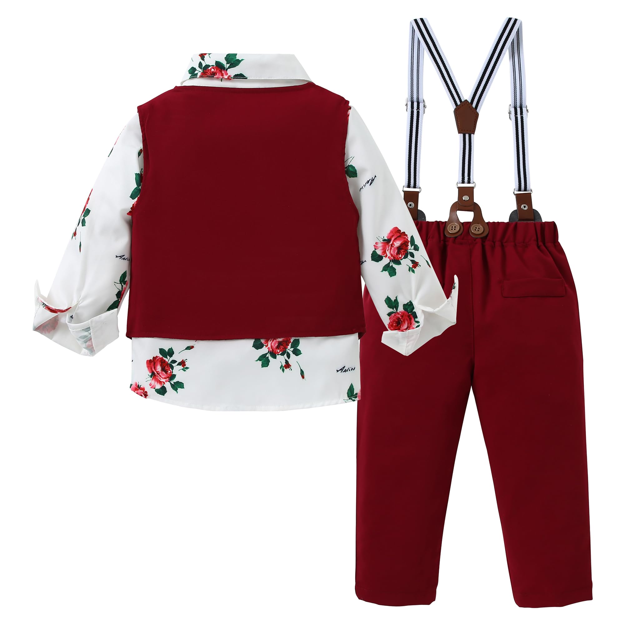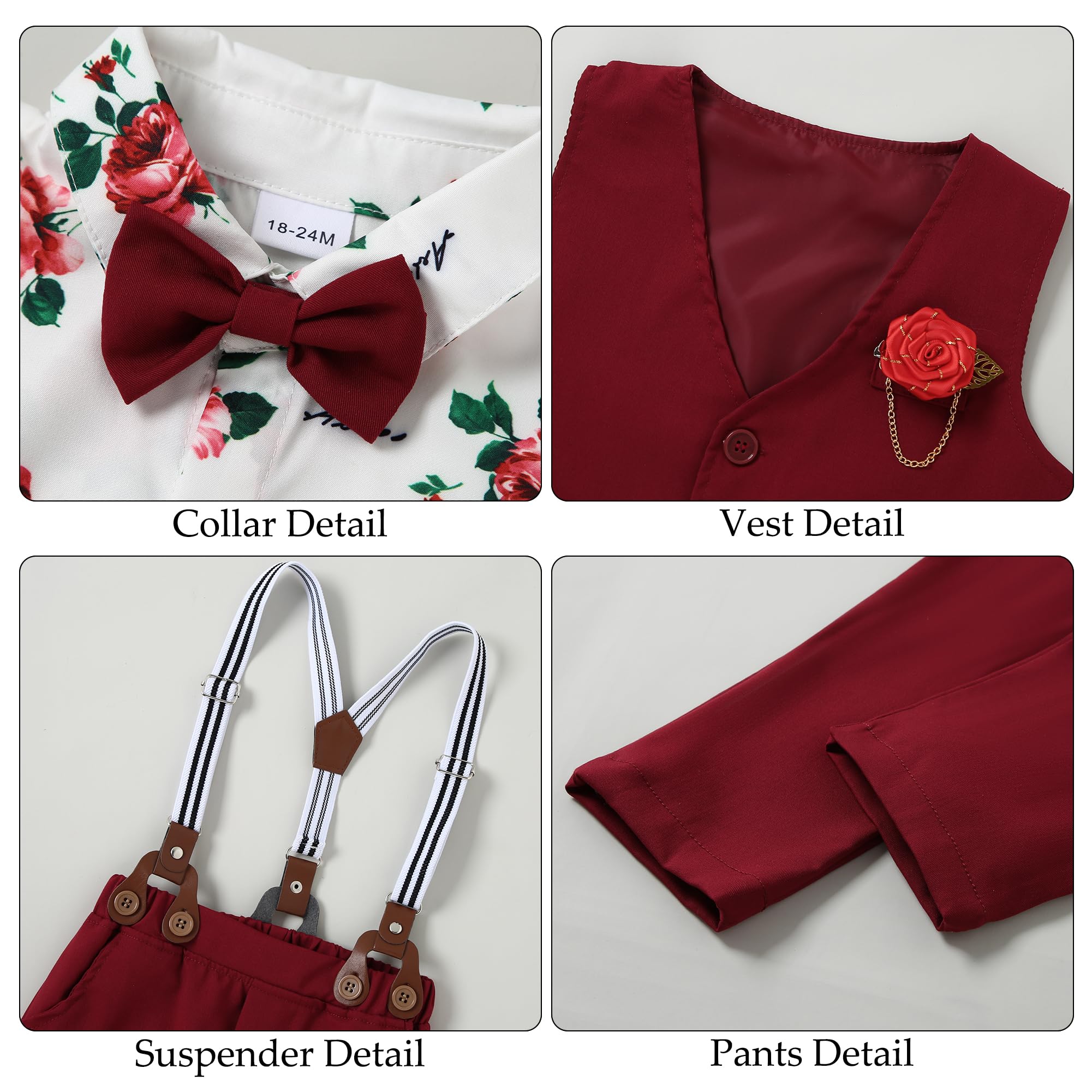 6-Pieces Formal Suit Set: This toddler suit including 1PC long sleeve dress shirt+ 1PC vest + 1PC suspender pants + 1PC detachable bow tie + 1PC elegant boutonniere.