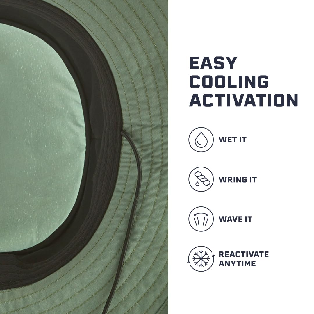 WATER & SWEAT ACTIVATED TECHNOLOGY: This cooling wide-brim hat incorporates advanced Wet-to-Cool Technology, which absorbs water or sweat to cool the hat by up to 30 degrees below average body temperature in under 1 minute. This innovative feature allows the hat to stay cool for up to 2 hours or longer with reactivation. By keeping cool, you can stay focused and dedicated to your activities without distraction. To activate your hat, simply follow these 3 steps: wet, wring, and wave.