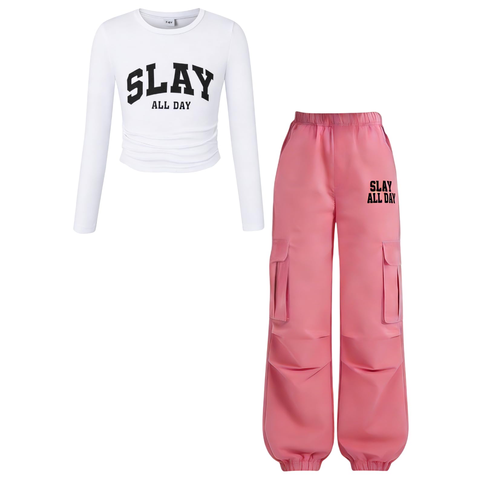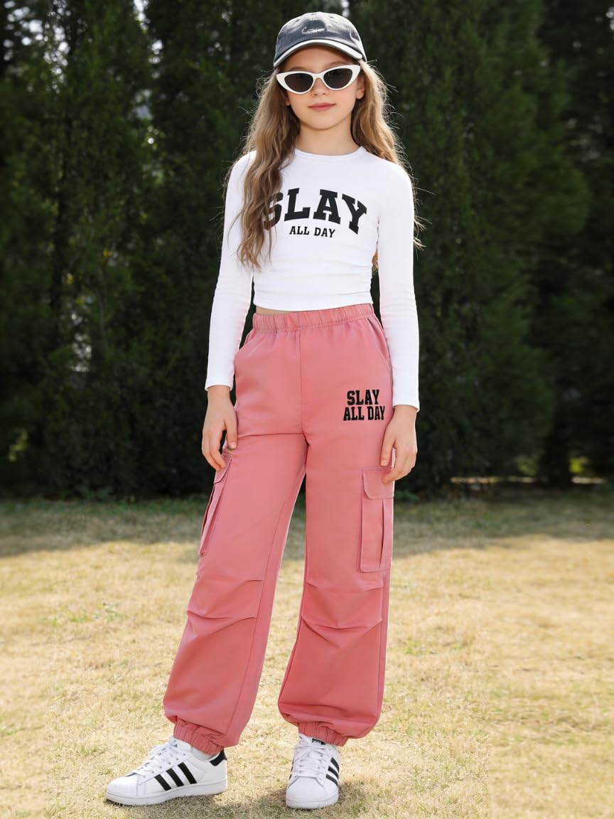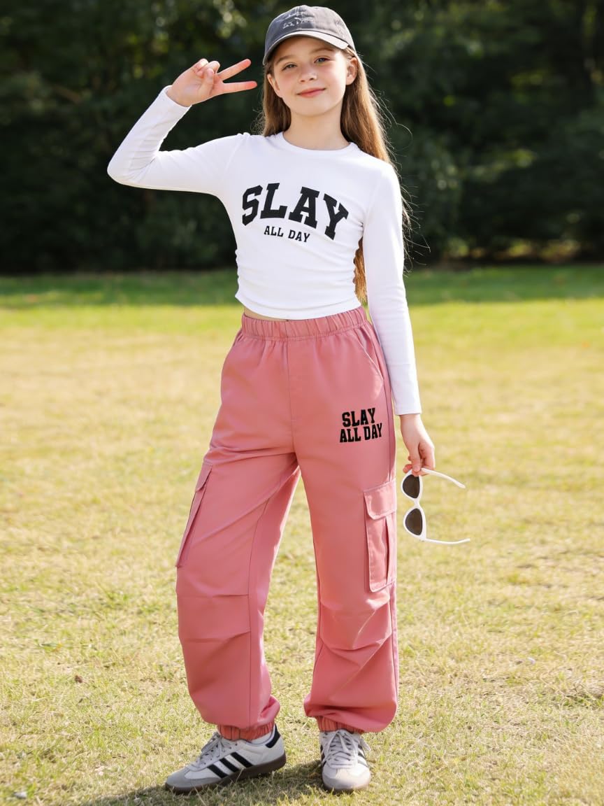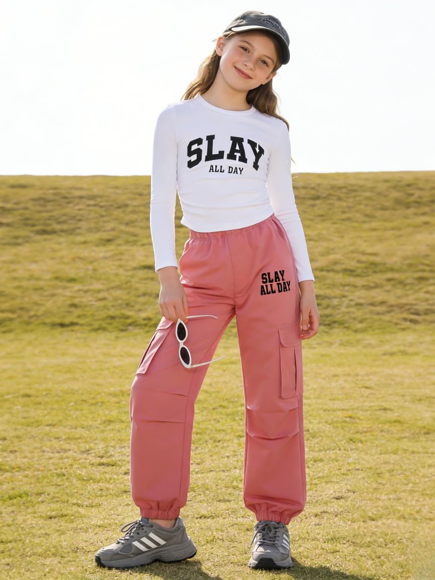 Description This tween girls clothes set includes a graphic print long sleeve top and matching jogger pants, designed for girls ages 7–16 years. The bold lettering adds a trendy streetwear vibe loved by tween and teen girls. Made from soft and breathable fabric, this outfit provides all-day comfort for school wear, casual outings, and everyday activities. The jogger pants feature an elastic waistband and cuffed ankles, offering a relaxed yet stylish fit that allows freedom of movement for active girls. Suitable for spring, summer, fall, and winter, this 2 piece outfit can be worn on its own or layered with jackets and coats in cooler seasons. Perfect for school, travel, sports-inspired outfits, and daily casual wear, this tween and teen girls outfit set is both fashionable and practical.
