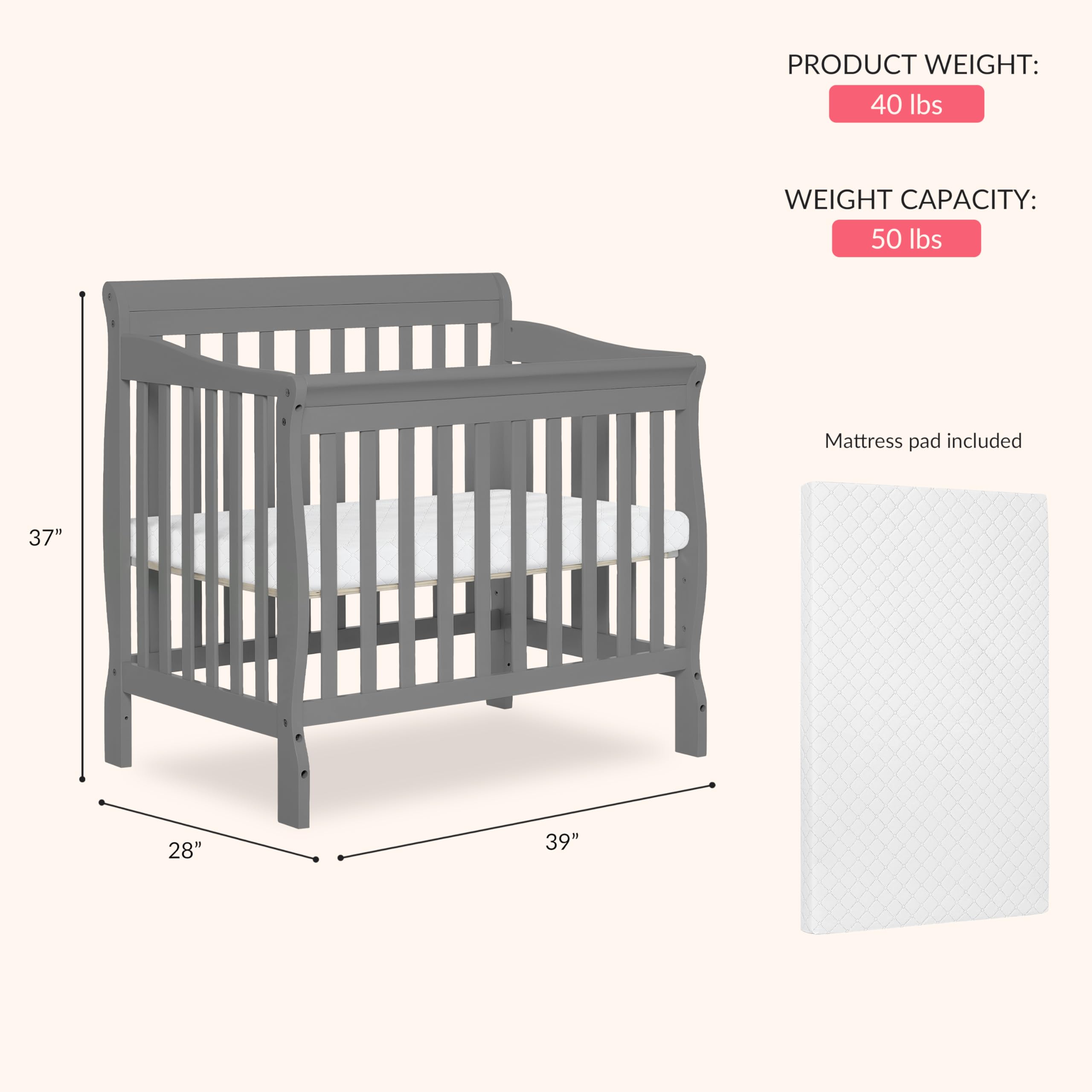 Included Mattress Pad & Perfect Fit – Comes with a 1” mattress pad for added comfort and is designed to fit any Dream On Me Greenguard Gold Certified mini crib mattress. The crib measures 39" L x 28" W x 38" H , making it a reliable, space-saving choice for your nursery.