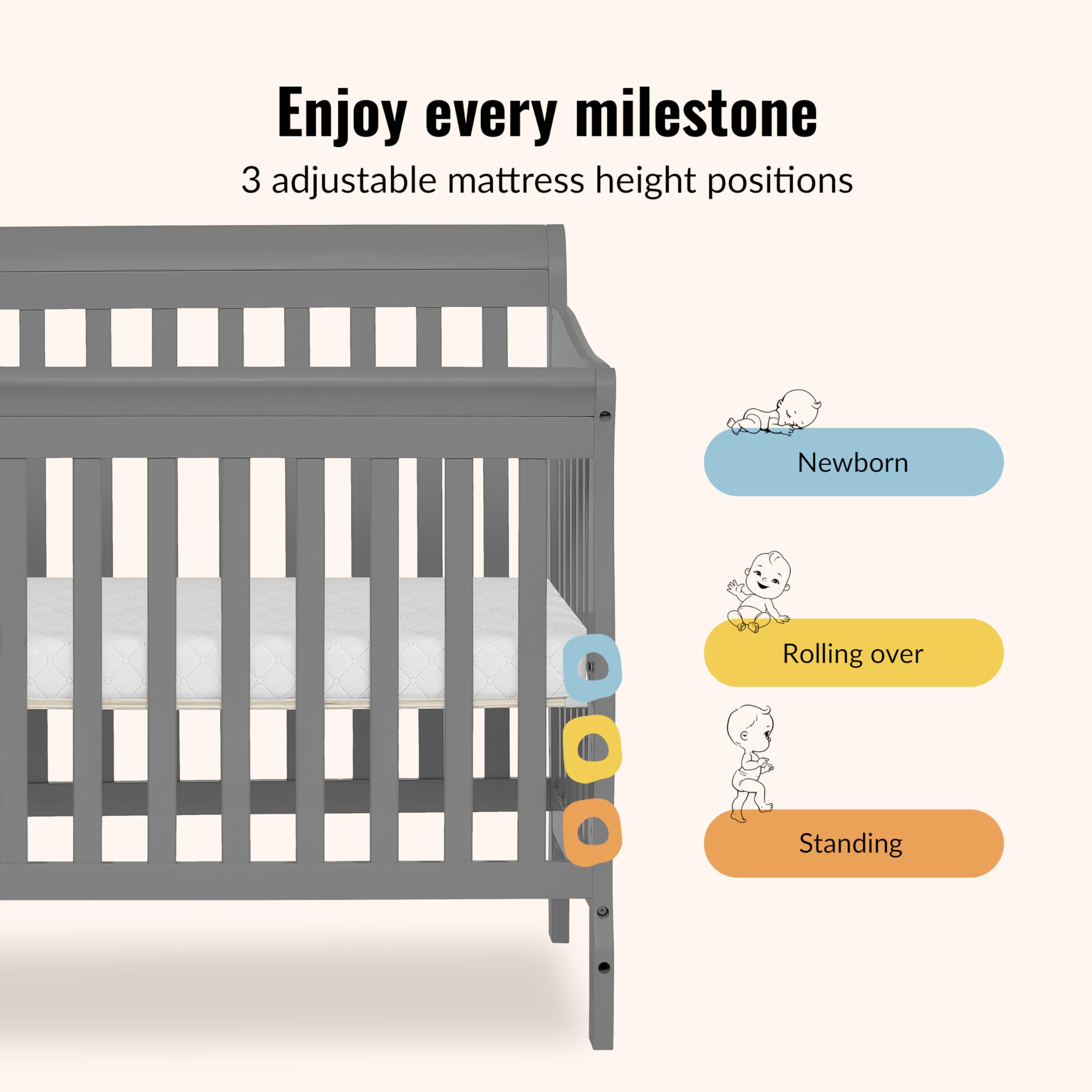 Sturdy Craftsmanship: Built from New Zealand pinewood for durability and elegance, with versatile finishes designed to match any nursery style. Includes 3 adjustable mattress height positions to adapt as your child grows