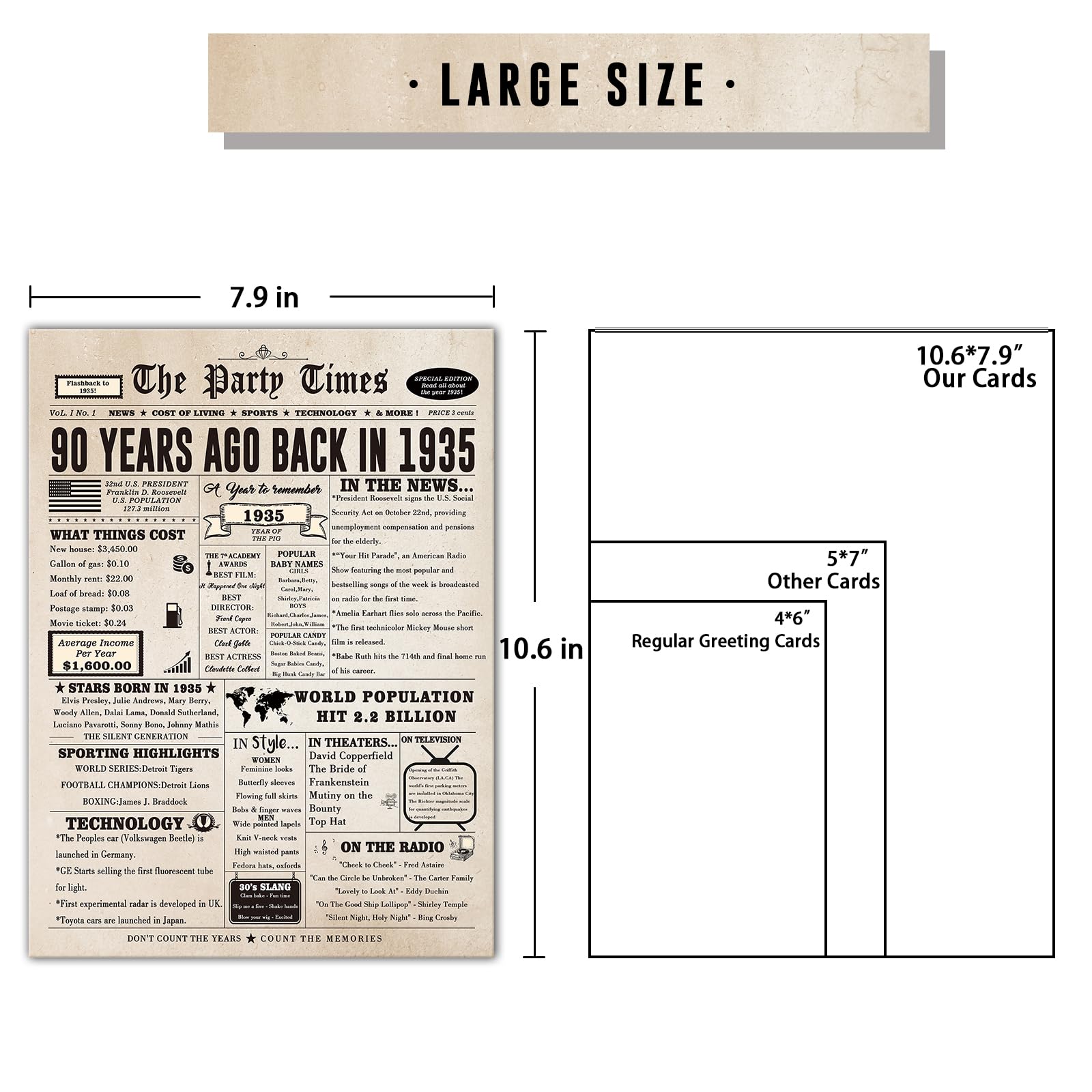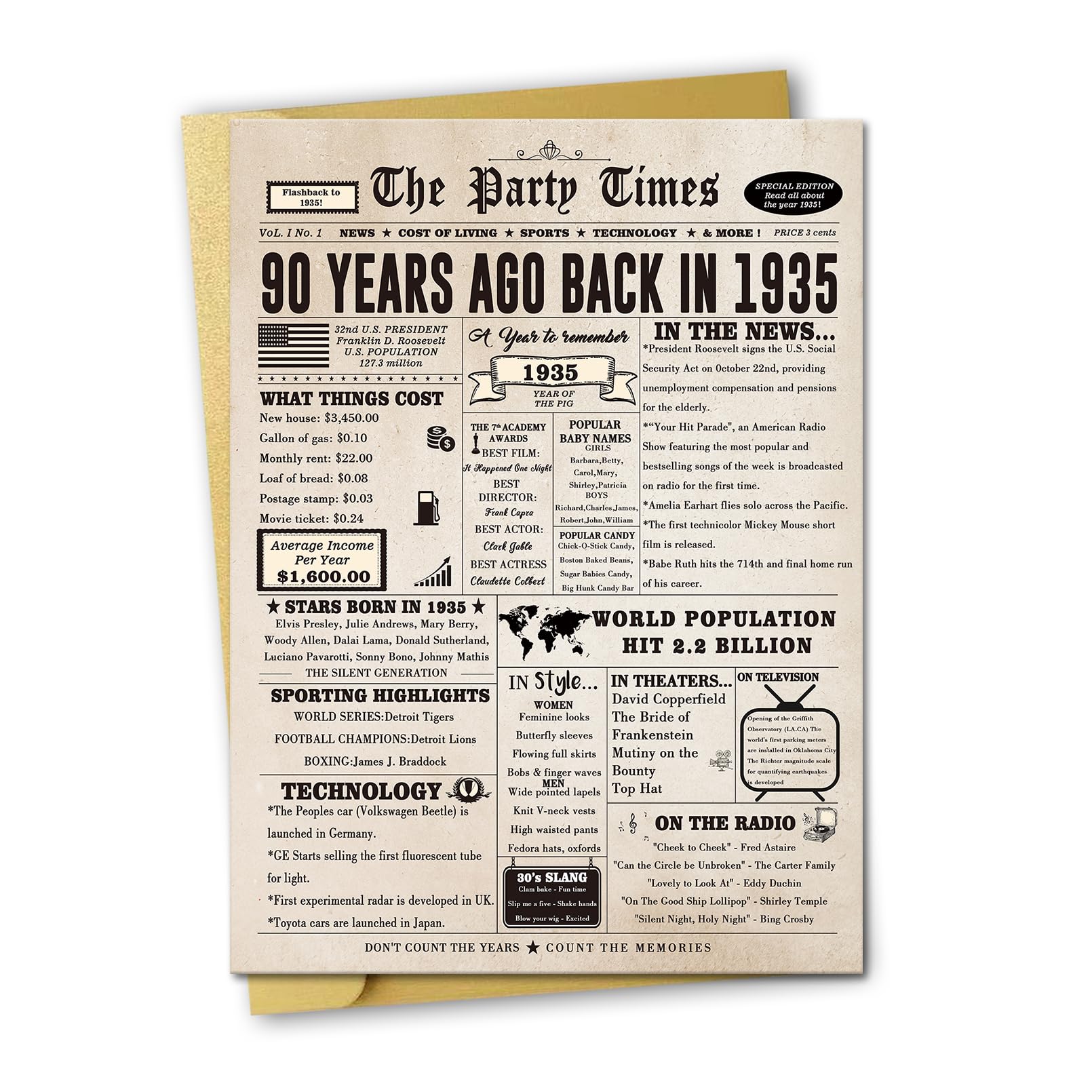 This large 90th birthday card features a vintage newspaper design, showcasing important events, movies and sports events from 90 years ago.
