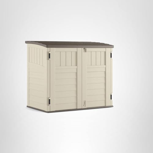 Discover smart, secure storage with the Suncast 34 Cu Ft Shed. Designed to handle year-round use, this low-profile, weather-resistant shed is perfect for patios, side yards, or tight outdoor spaces. Made from durable, all-weather resin, it resists rust, rot, and UV damage while keeping your gear dry with its water-resistant design. Whether you need a backyard shed for storage with floor base or a reliable outdoor trashcan enclosure, this shed adapts to your needs. The easy-lift lid includes a stay-open prop rod for convenience, while the lockable lid and double doors offer secure access (padlock not included). Inside, it fits everything from patio cushions and gardening tools to a push lawn mower, generator, or pool equipment. This compact outside shed also supports DIY modifications wherein customers add vents for airflow or install shelves for customized organization. Whether you're using it as an outdoor garbage can enclosure, a generator enclosure, or a place to declutter your yard, it's a tough, low-maintenance solution built for real life. Proudly made in the USA, the Suncast 34 Cu Ft Shed offers outdoor utility with confidence and convenience