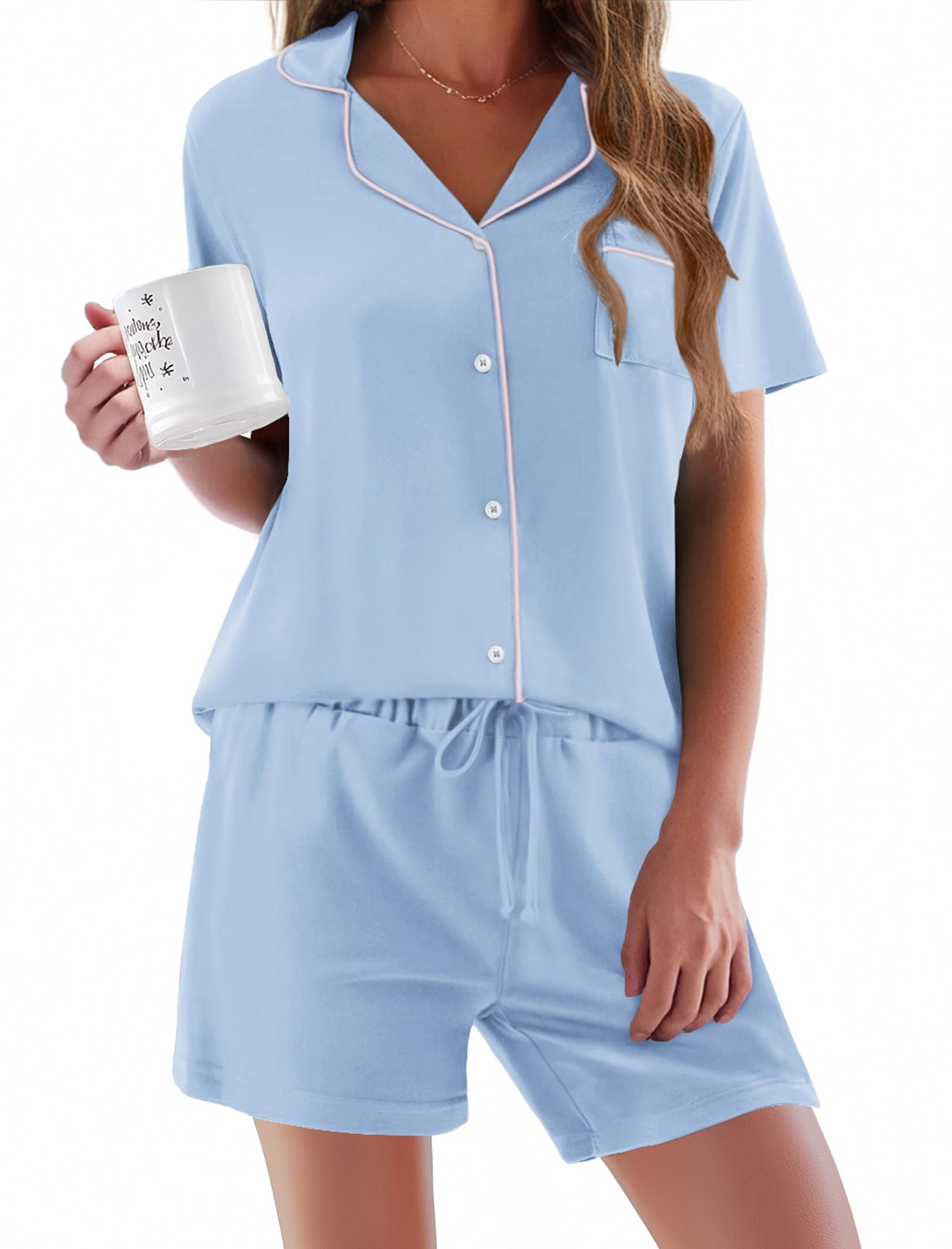 HUMANIZATION DESIGN: Features a hip-length button-down top with notch collar and chest pocket. Shorts include a chiffon drawstring elastic waist for maximum comfort.