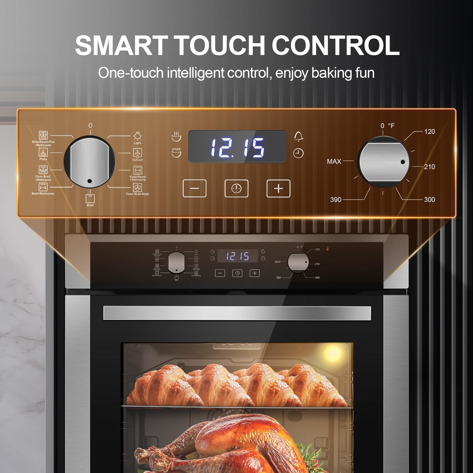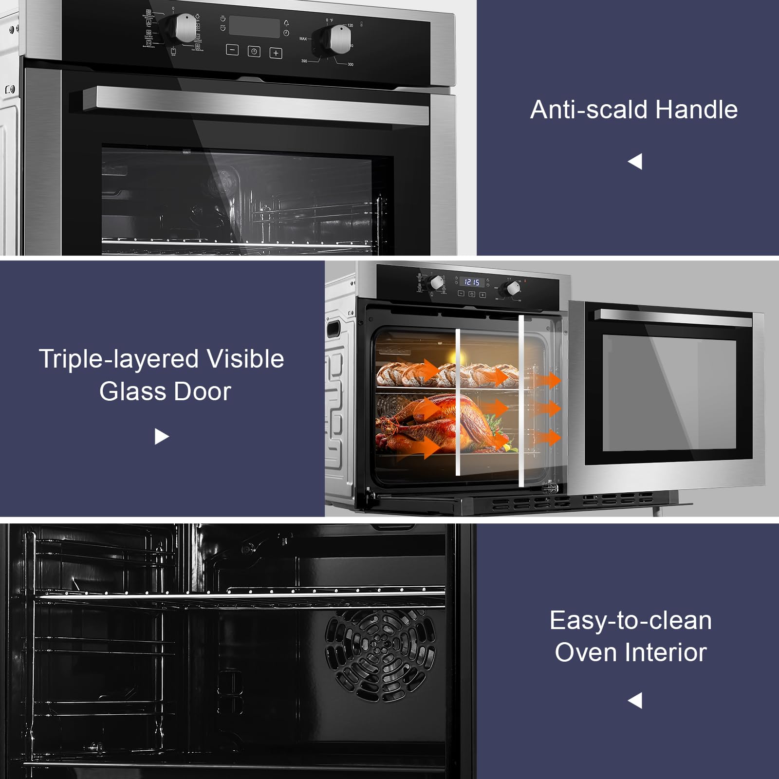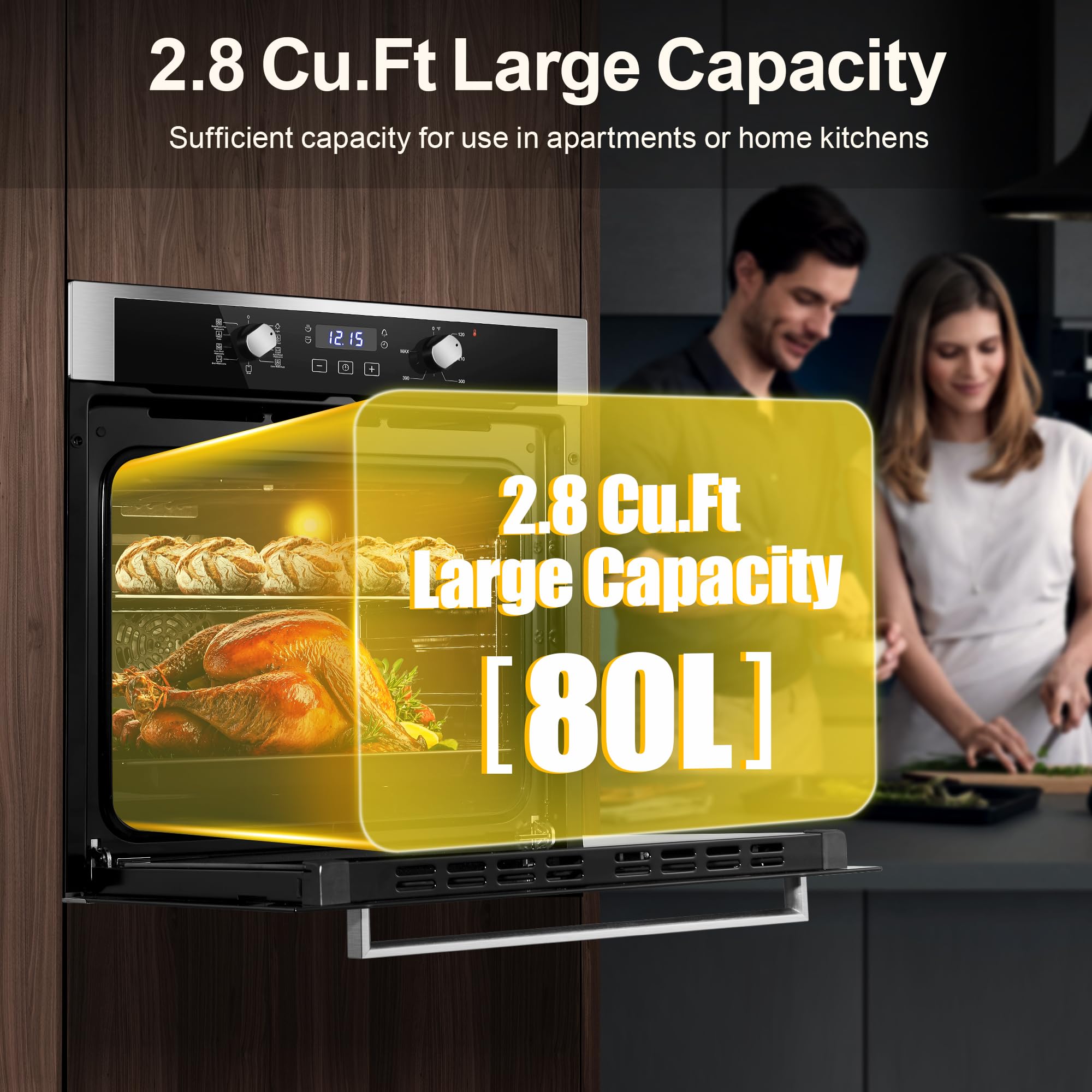 [Powerful 3220W Performance & Large 2.8cu. ft Capacity]Built for demanding use, this wall oven delivers robust 3220W power for fast preheating and consistent heat up to 250°C. Its spacious 2.80 cu. ft. black enamel cavity accommodates multiple trays with ease, making it an ideal powerhouse for family meals or entertaining guests.