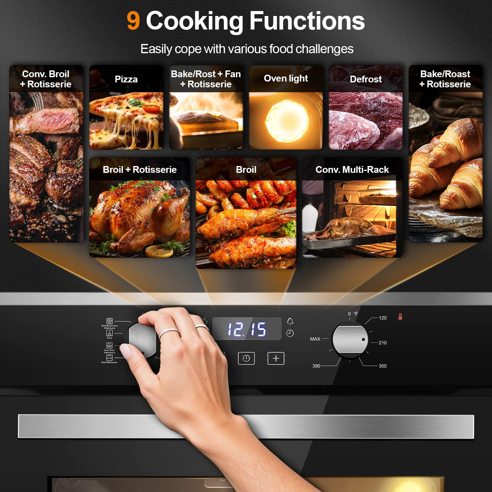 [9 Cooking Functions with Convection]This oven masters 9 preset functions, from baking to defrosting, including a professional 360° rotisserie that steadily rotates whole chickens and large roasts for even cooking. Its convection fan circulates heat efficiently, ensuring superior browning, reduced cooking times, and guaranteed professional results.