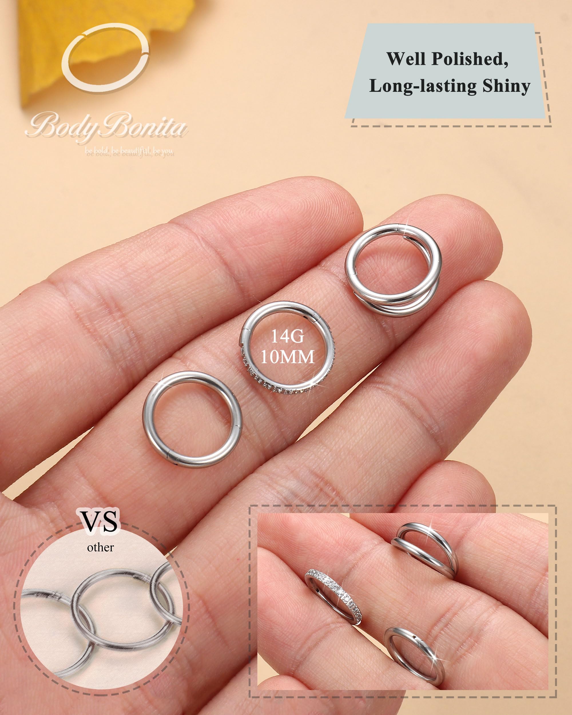 Description What you get: 3 pcs of BodyBonita seamless nose ring(14K gold plated/silver/black plated/rose gold plated ), crafted to be brilliantly shiny, hypoallergenic, and effortlessly easy to put in and take out. Materials: 316L stainless steel. Style in One Package: cubic zirconia nose hoop, double nose ring hoop, classic single nose rings hoop. Available Color: 14K gold plated/silver/black plated/rose gold plated. Avaliable Gauges Size: 14g, 16g, 18g, 20g. Avaliable Inner Diameter : 7mm, 8mm, 9mm, 10mm. Product Types: Lip piercing/aretes para labios, Septum ring, Hoop belly button rings, Cartilage earring, Daith piercing jewelry, Conch hoop earring, Helix earring, Tragus earring, Rook earrings, Acero inocidable dorado arete percing, Nipple rings.