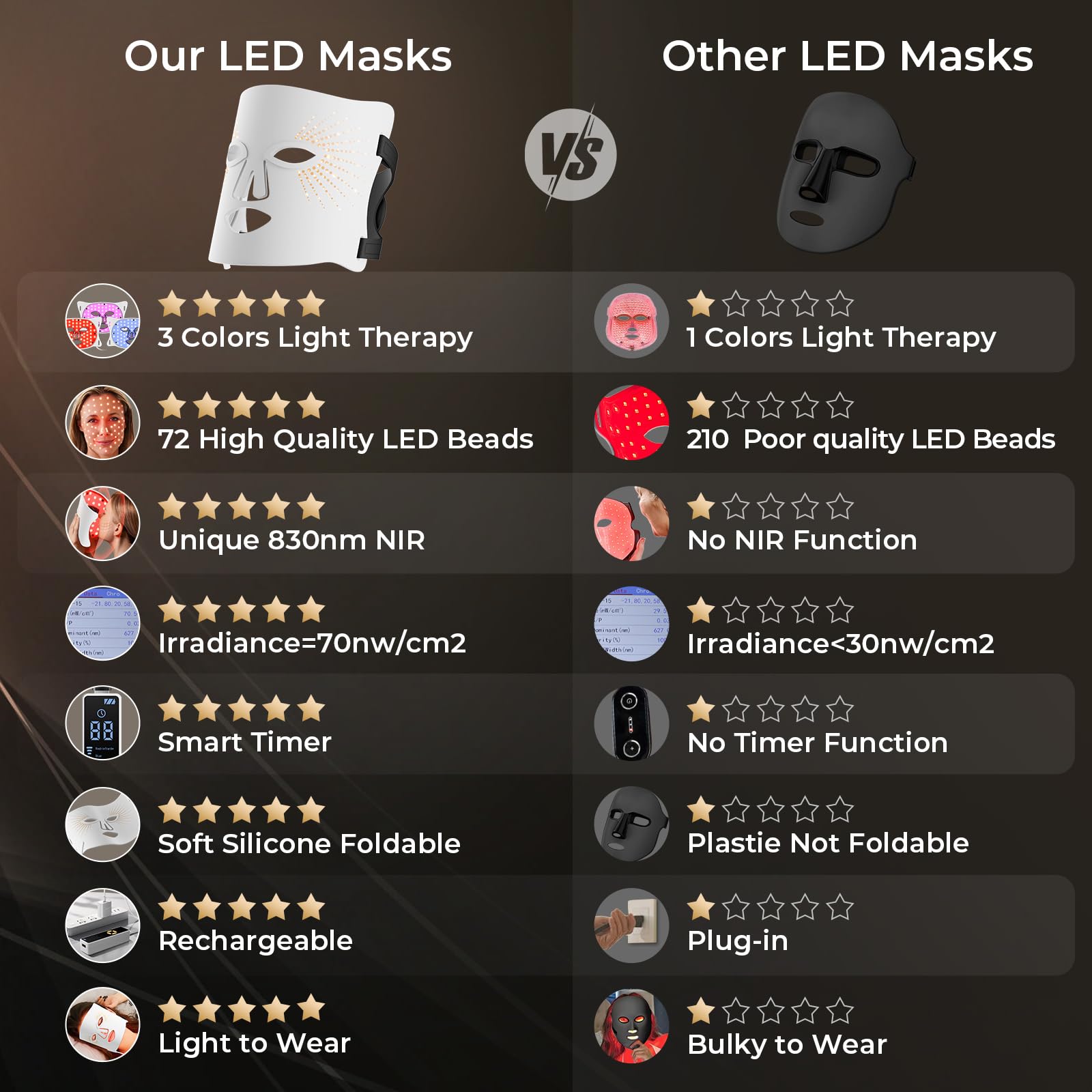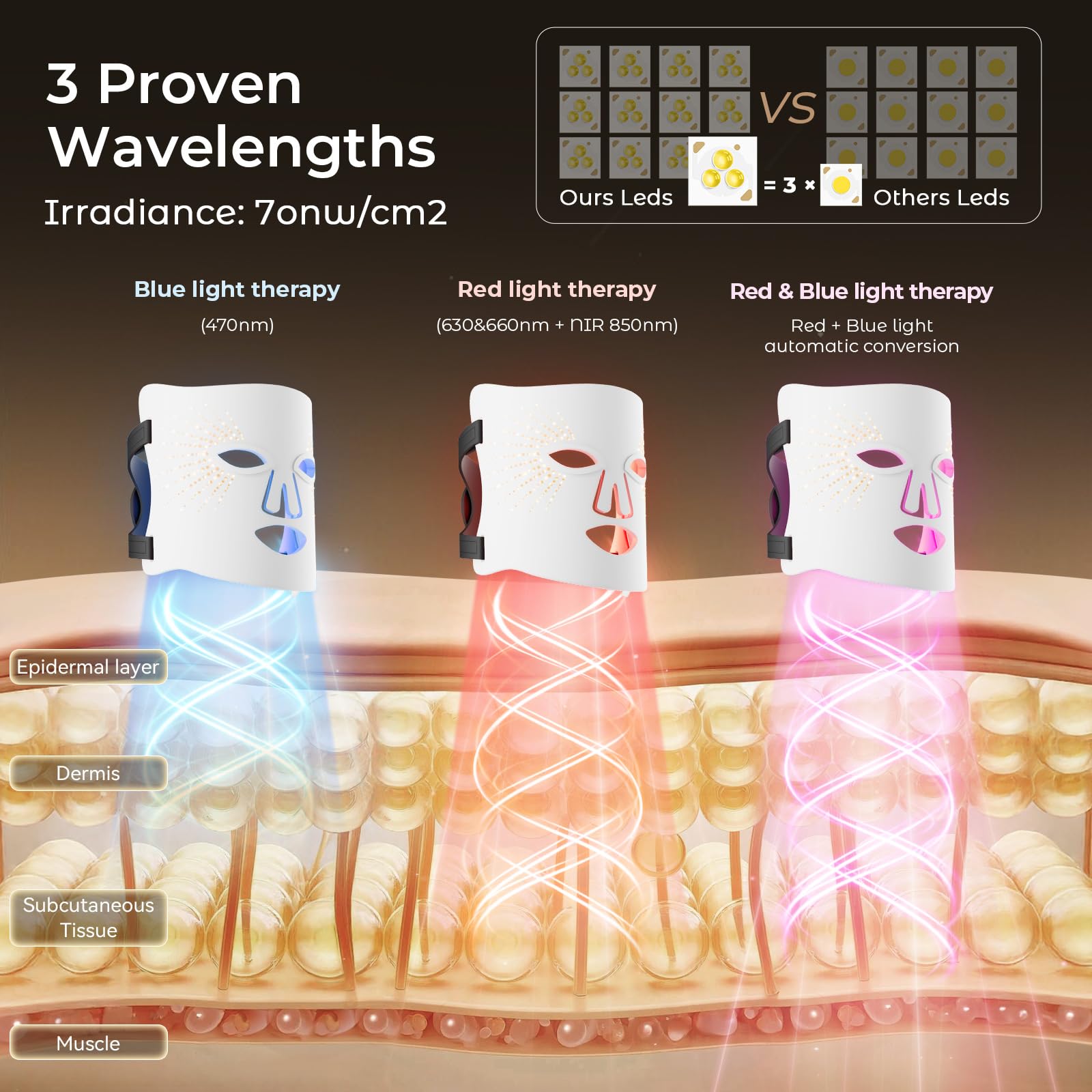 【3 Gears Red Light Therapy for Face】Red light (630nm) + Near-infrared light (830nm),3 gears.The combination of red light and near-infrared light which is the best combination to increase skin elasticity and gloss.Red light can help balance oil secretion.Red light helps improve skin redness.The irradiance of the product is 70nw/cm2.Experience the transformative effects of our red light therapy mask, designed to achieve rejuvenated, glowing skin.